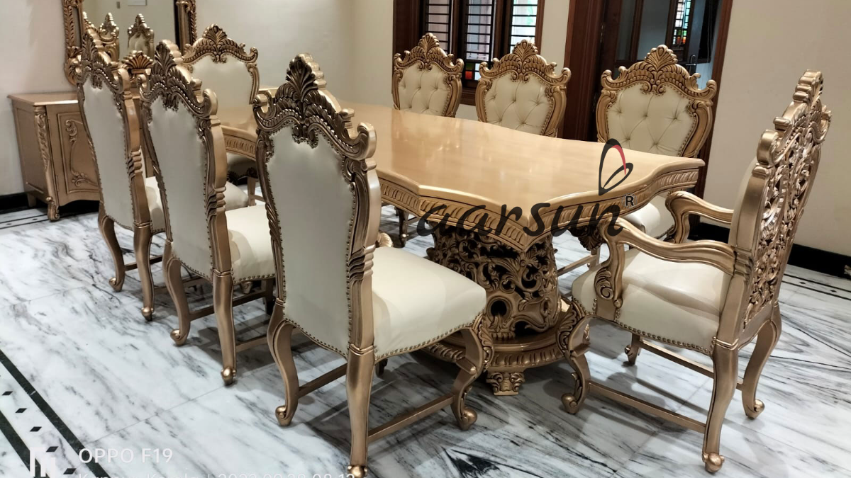 This is a Royal Handcrafted Wooden Dining Set fully carved unit, with chairs with double-sided hand carvings and with cushioned back. The table is with heavily carved legs. The client ordered an 8-seater dining set. The heavily carved dining top looks so beautiful, with carving work visible through the glass placed on the top of the table. This dining set is in antique gold which looks so royal and luxurious. This is an overall carved unit done by our skilled master artisans.