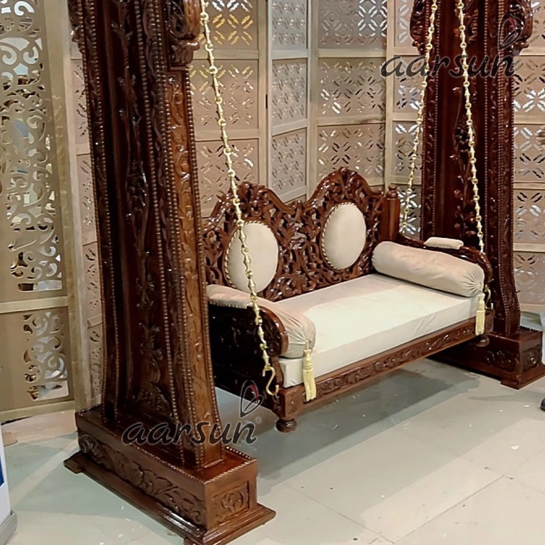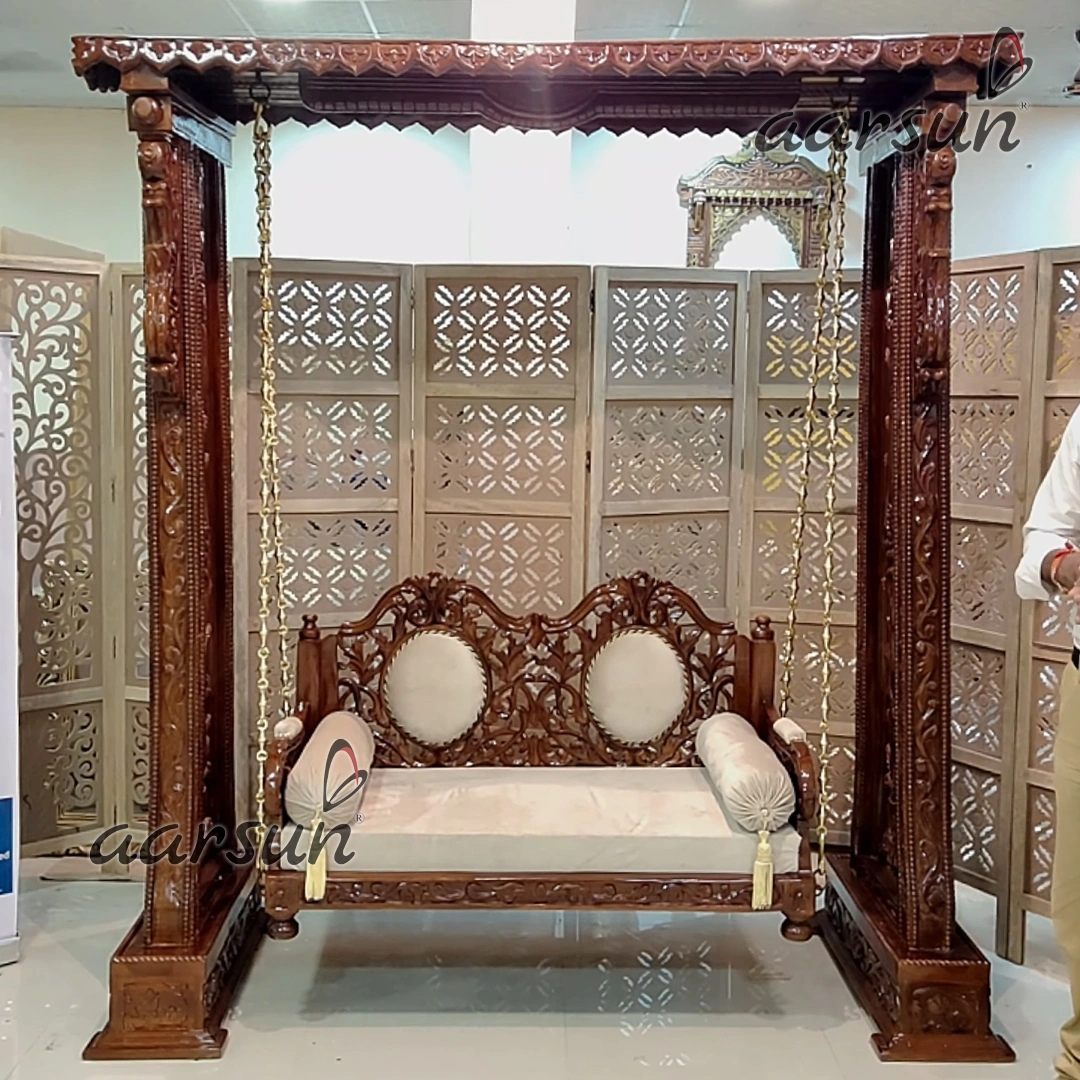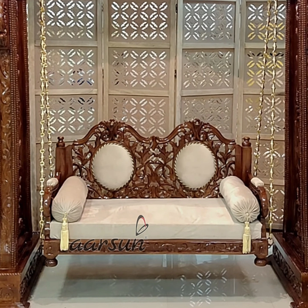 At Aarsun, we make what you want and believe in providing quality that lasts for generations. This particular swing is made in Teak Wood carved out in a traditional pattern. This swing design has a full roof instead of a beam as in the regular swings. Also, it is 360-degree carved out and can be used from both sides. The chair can be rotated accordingly.