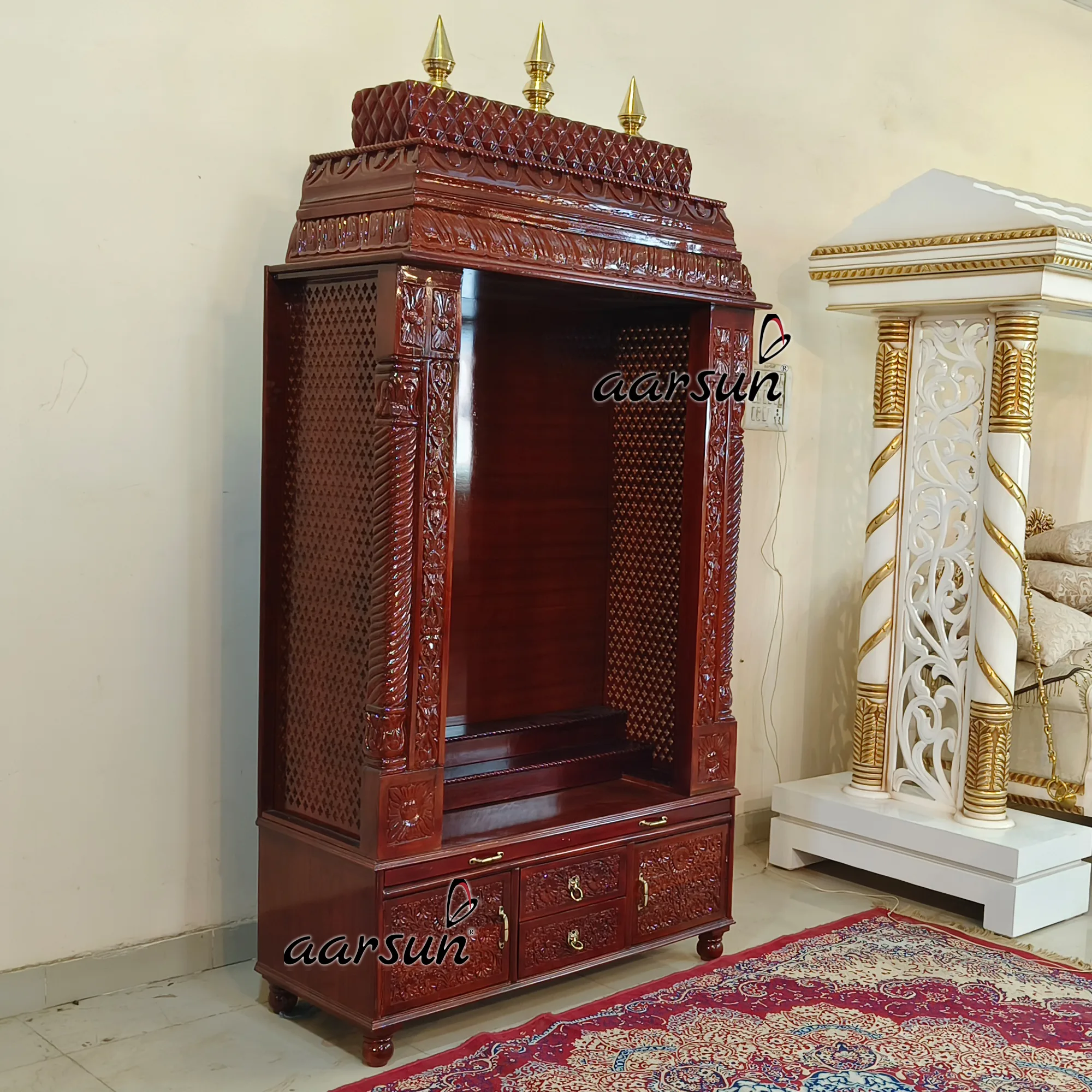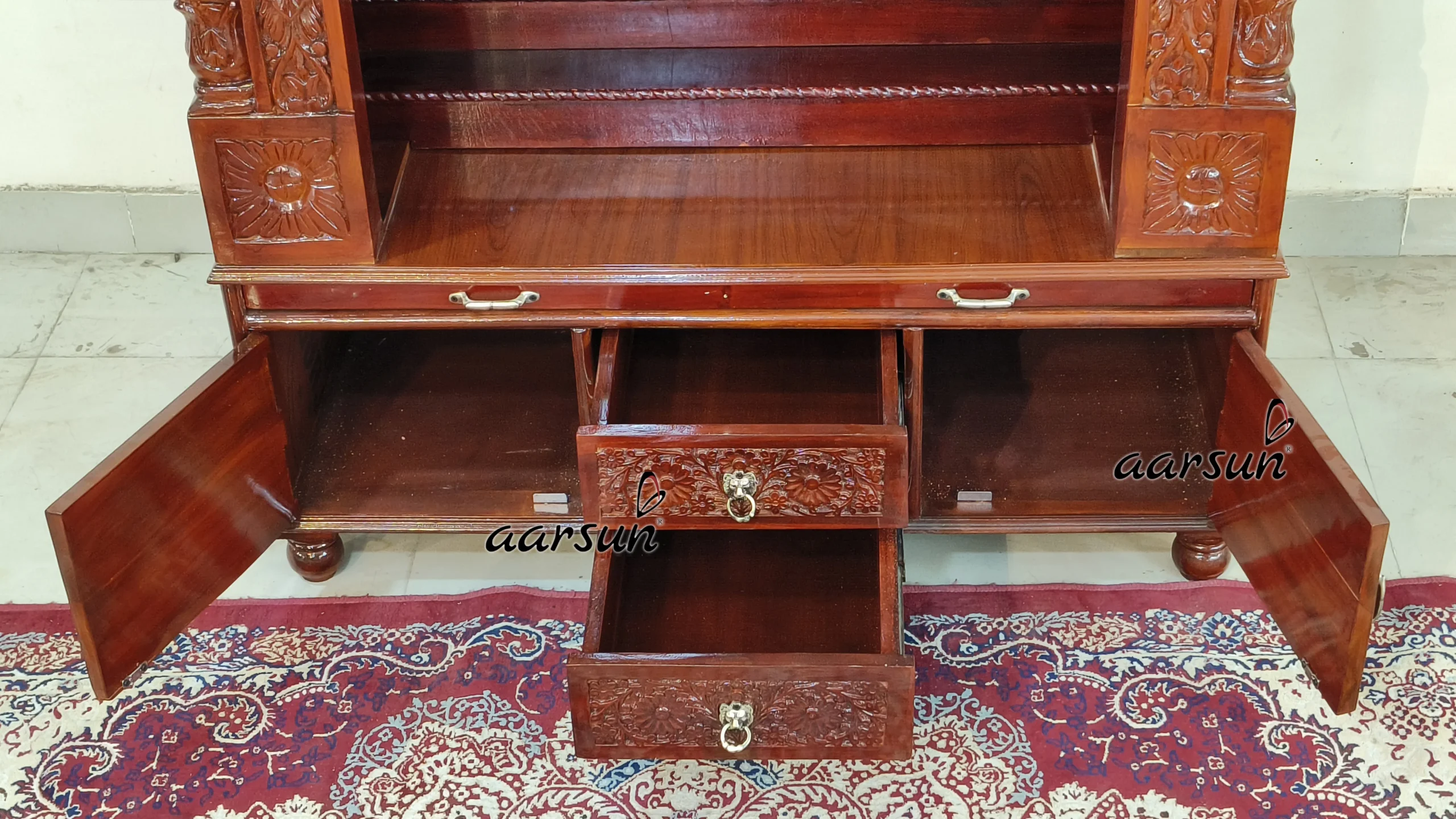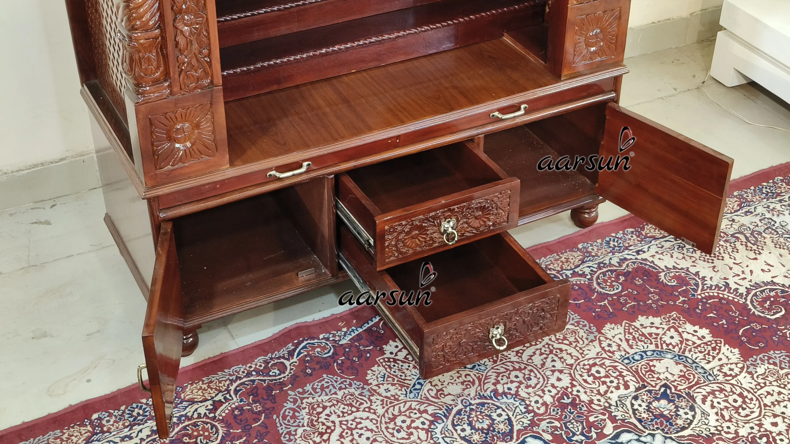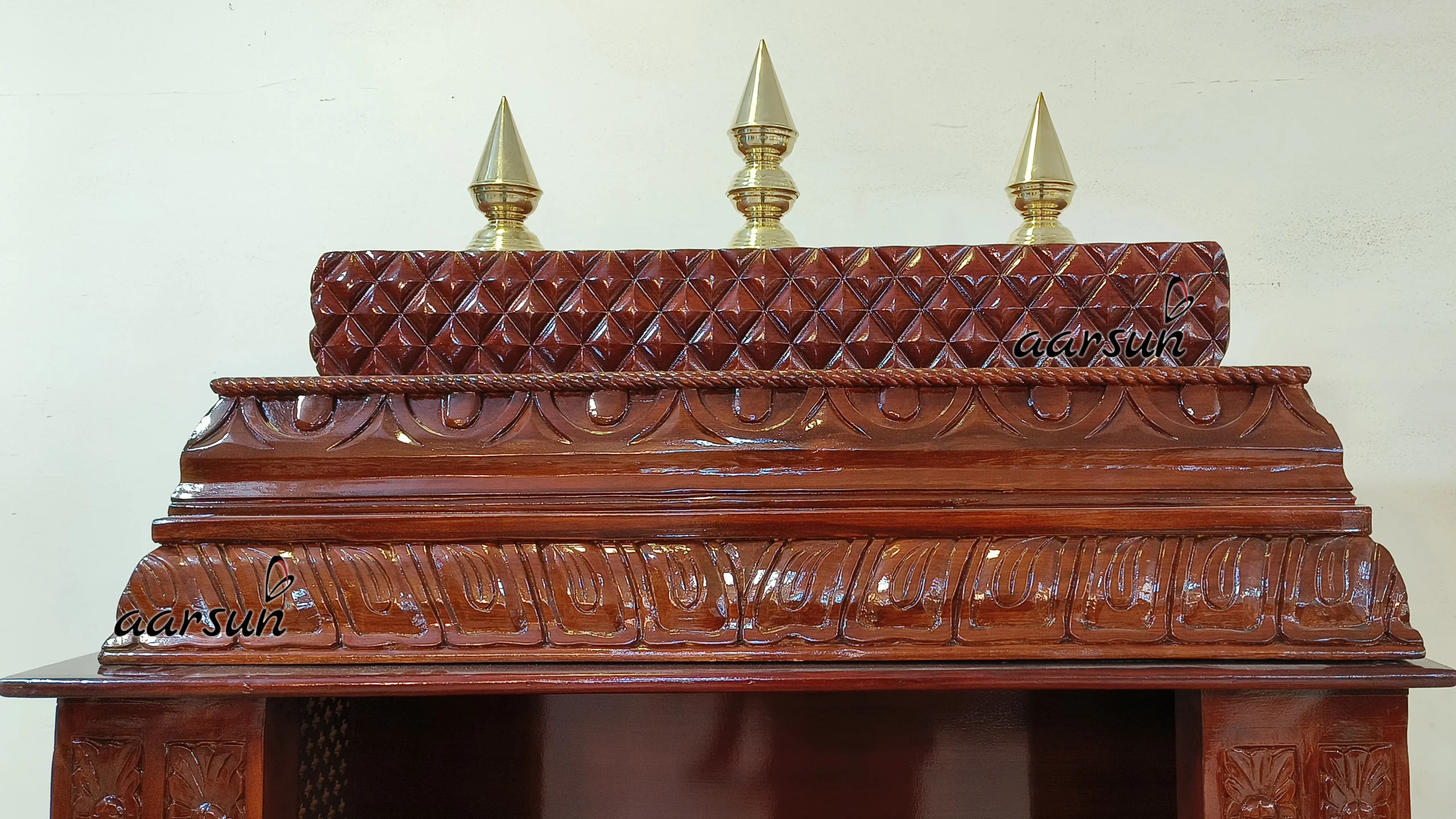 Aarsun Woods presents a luxury South Indian Home Temple design, which is the most liked design. This temple is without doors. This temple ensures durability because it is made in solid teak wood. This is a fully hand-crafted temple and an epitome of excellent workmanship . This temple has a south style gopuram design with 3 shining brass bails placed at the top of it. The centre part is the sanctum or garbhagriha space with two removable steps for placing God idols or frames. The centre is without a door and thus provides an open garbhagriha for worshipping the god. The bottom part serves the storage purpose by having two big drawers and two big cabinets. A big bhog tray beneath the sanctum to serve the purpose of doing offerings to God. The side panels of the temple are adorned with beautiful jali work. This temple is in walnut finish, which gives an extremely eye-catching look to the temple.