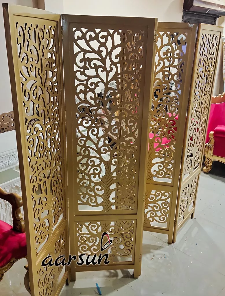 Aarsun Wooden 5 Panel Room Partition in Gold Polish Without Stand in fine quality wood and MDF; with fine carving and finishing Unique Room Divider.