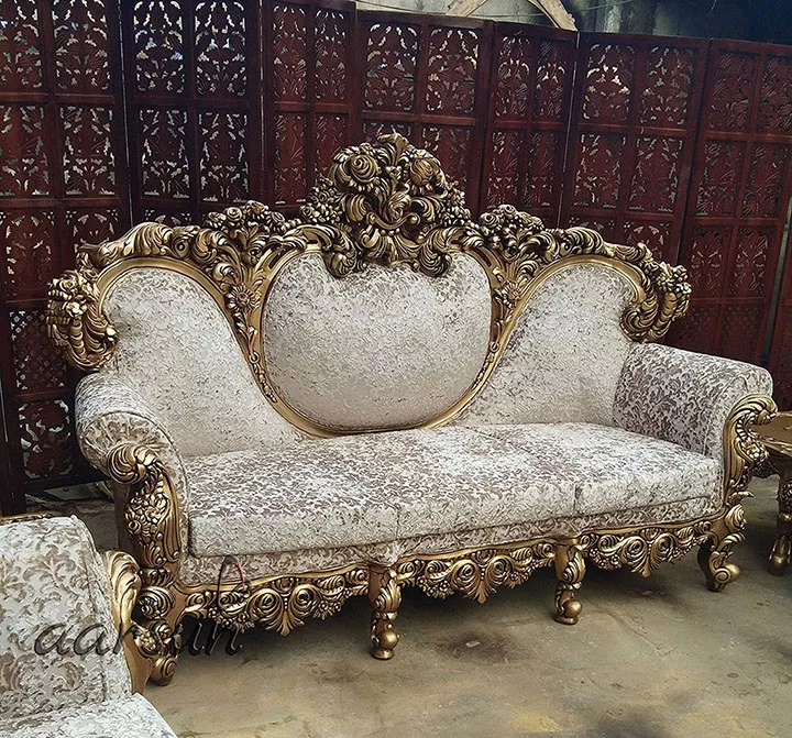 Aarsun brings to you a modern and comfortable Teak Wood Maharaja Sofa Set for your living room. The 7 seater sofa set is made of premium quality Teak Wood with both sides of floral carving. It has an elegant design that enhances the interior decor of your living room.