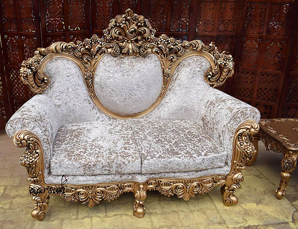 The upholstery of this sofa makes it very comfortable to sit at home, while the floral carving back gives the traditional look to the set. The front base consists of floral carving similar to the upper back. The unit is supported by four beautifully carved legs.