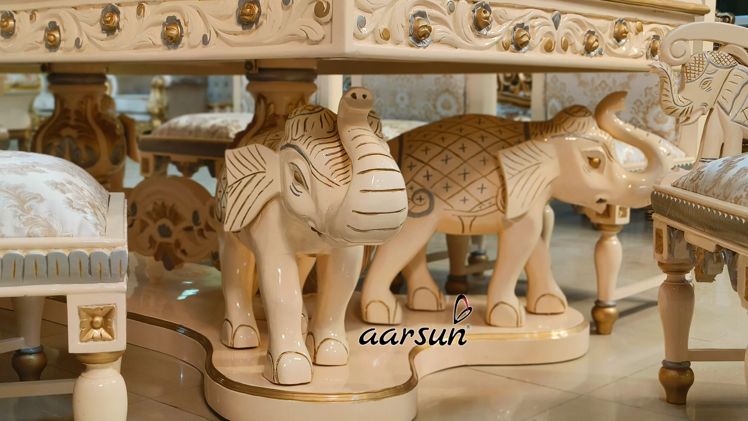 At Aarsun we curate unique pieces for you, talking about this dining set it has a very sophisticated base having elephant carving. But if you require something else we can curate that also. In addition to that it also has this beautiful elephant figures on the two main chairs. The seats are very well cushioned to provide desired comfort to the clients.