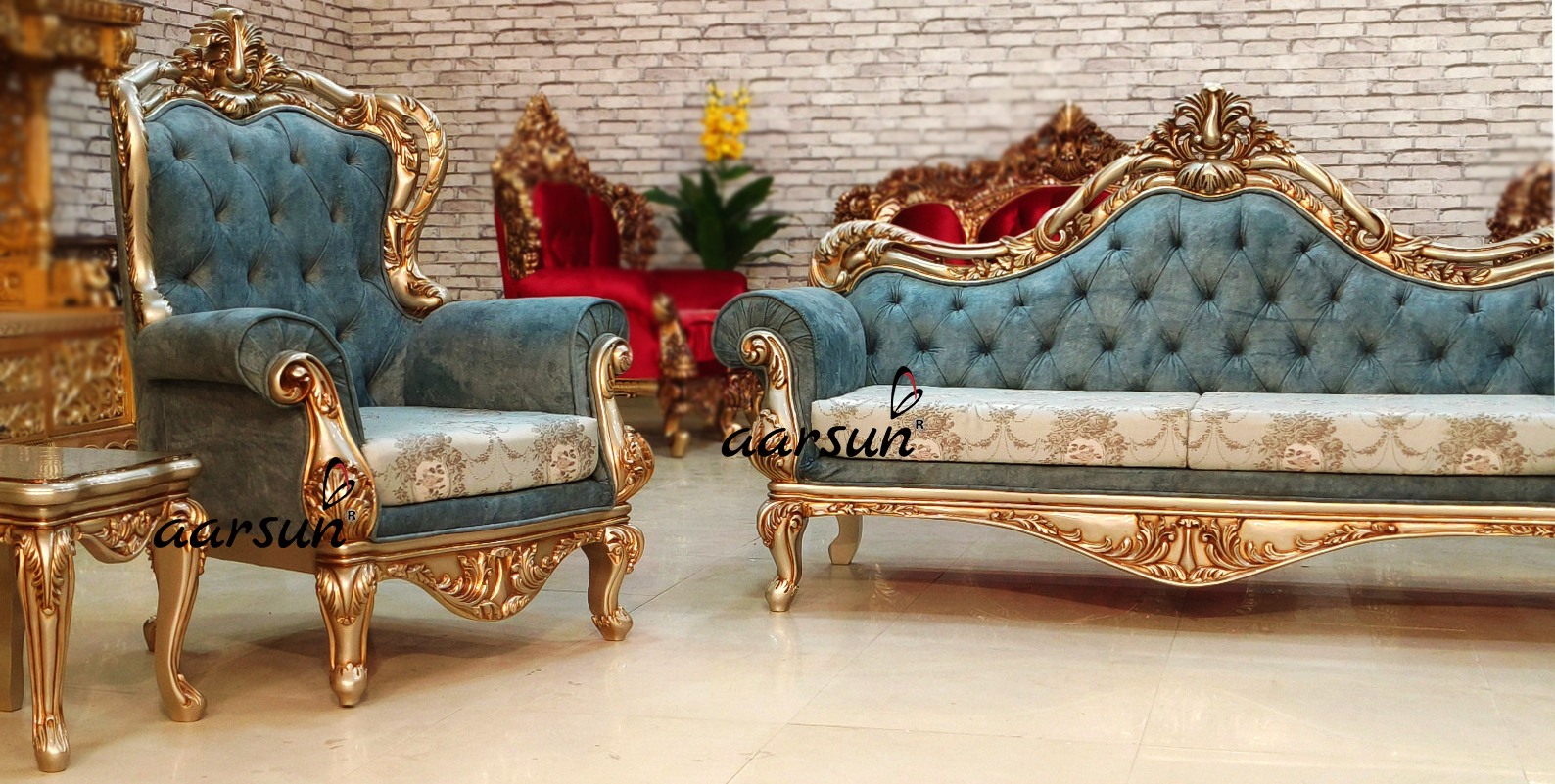 Aarsun brings you a heavy sofa set design is crafted from teak wood with champagne gold highlighting – a heavy design meticulously handmade by skilled artisans using hammer and chisels. The client selects the fabric, and the color theme focuses around champagne gold paint. The back features plain suede with tufted quilting, while the seat has a floral pattern fabric. The sofa chairs have a crown like shape inspired by the Maharaja sofa style, giving them a grand and elegant appearance. What’s special about the heavy sofa set design is that the chairs are double-carved, making them even more beautiful. The legs of the sofa chairs have curves and carvings, which adds to their charm.