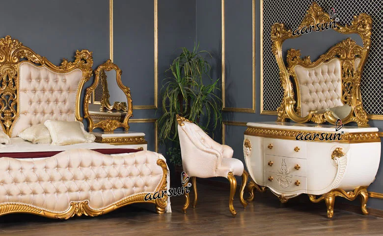 Presenting the ultimate Classic Bedroom Set in Antique gold finish by Aarsun ,these sets are made of high-quality Solid Teak Wood and are designed to last for many years. They often feature intricate designs and ornate details that are sure to impress.
