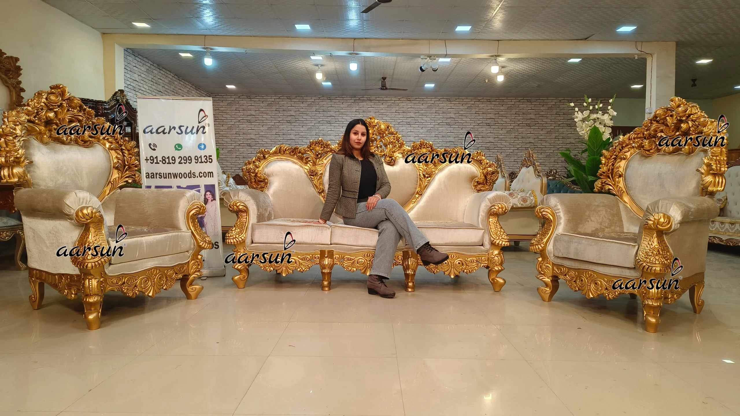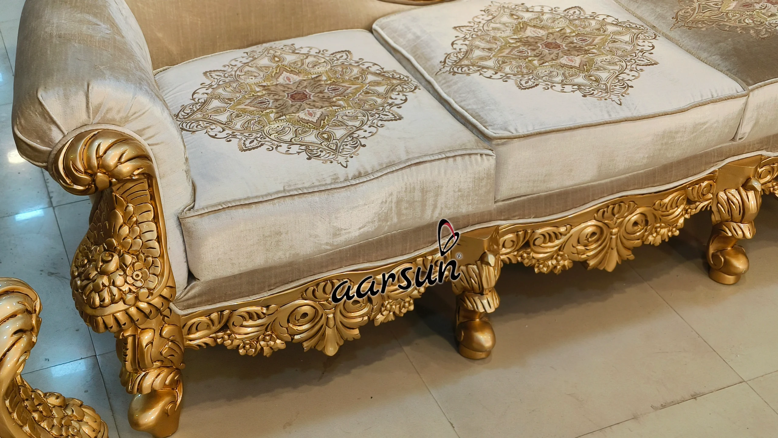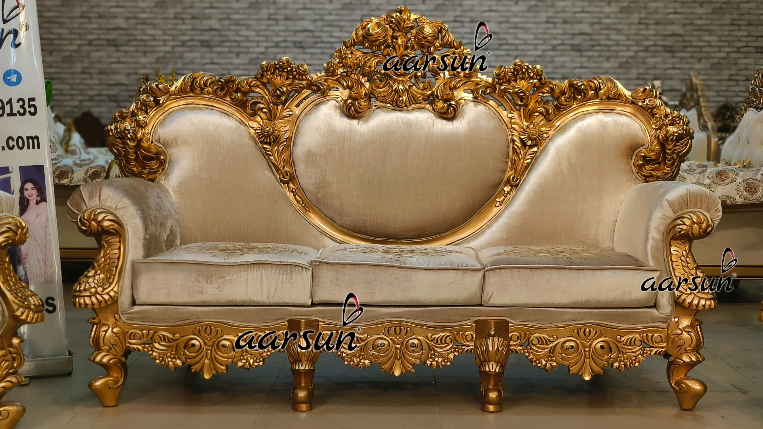 The beautiful armchairs are very well cushioned from the back and on the armrests  to provide comfort. The antique gold finish gives luxurious look to the overall set. You can also personalize this set according to your requirements. We provide customization , you only have to share measurements , design and theme. We will curate your masterpiece according to your customization.