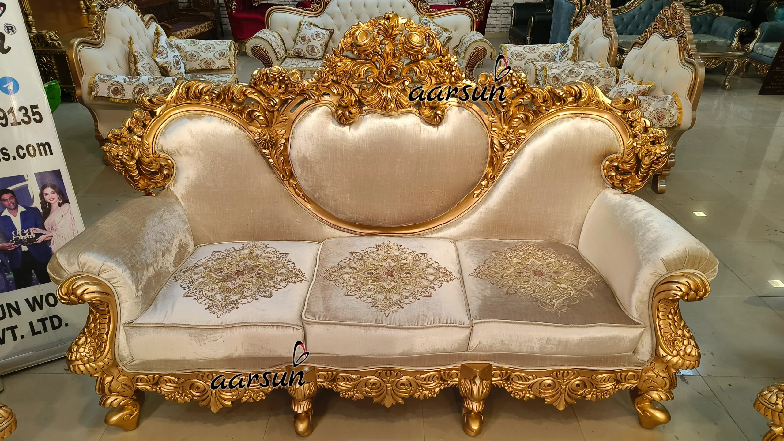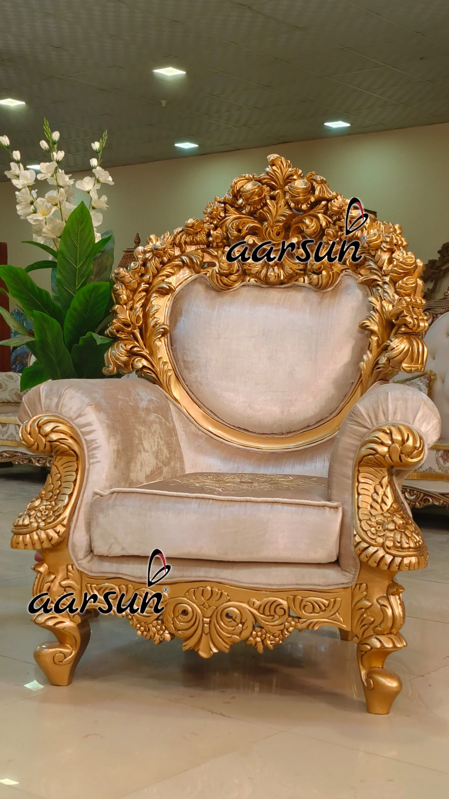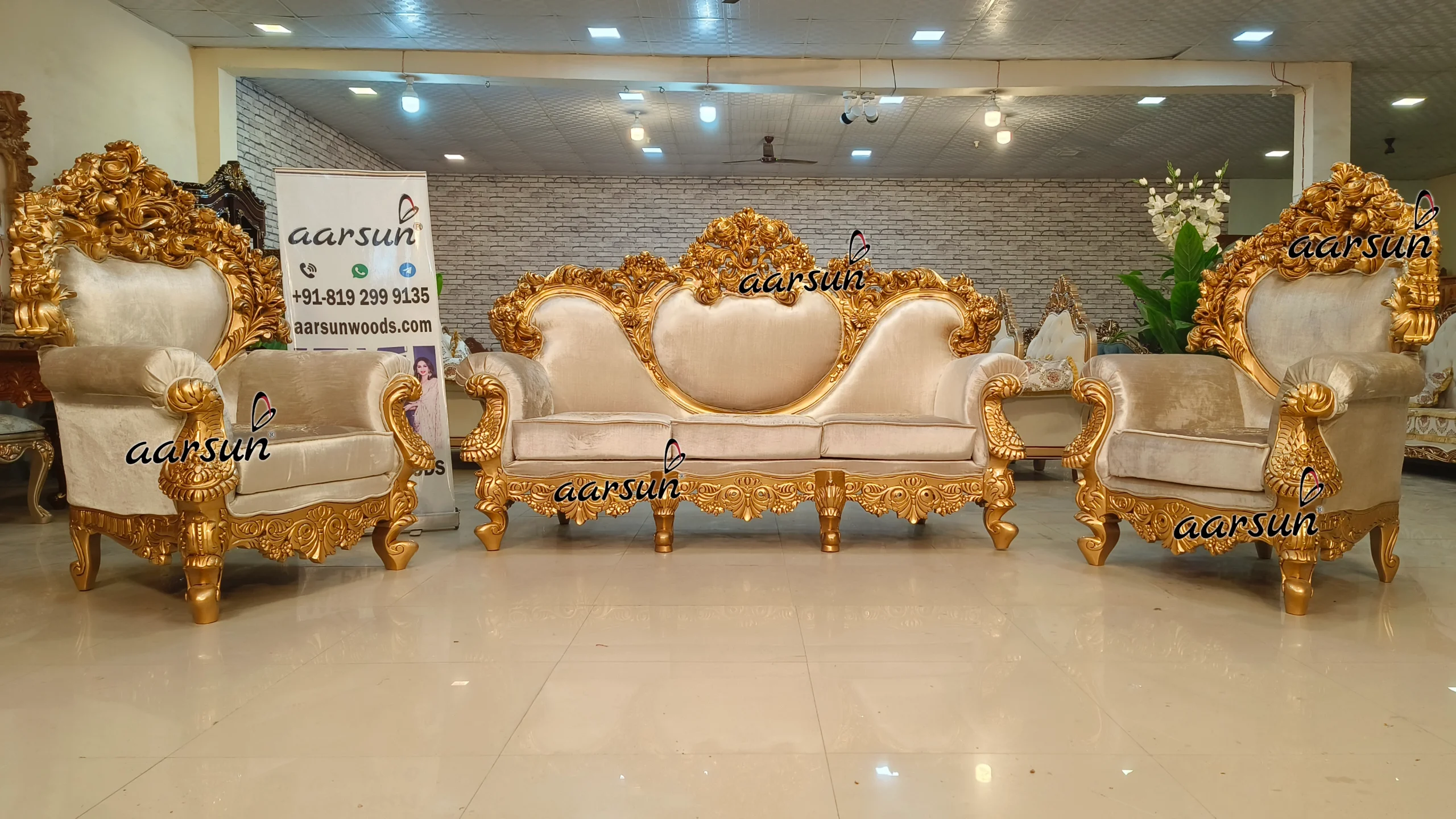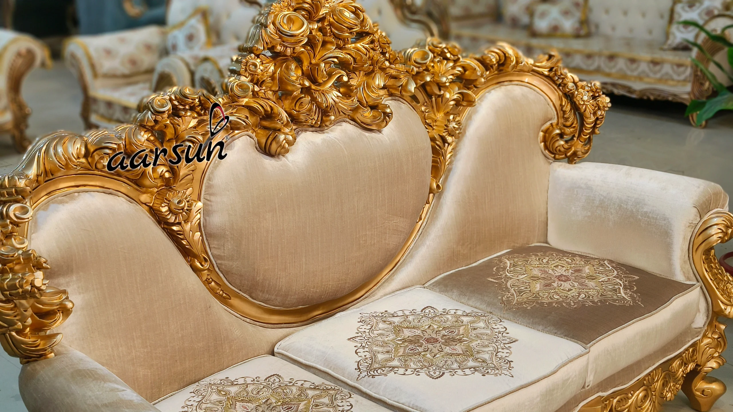 The beautiful armchairs are very well cushioned from the back and on the armrests  to provide comfort. The antique gold finish gives luxurious look to the overall set. You can also personalize this set according to your requirements. We provide customization , you only have to share measurements , design and theme. We will curate your masterpiece according to your customization.