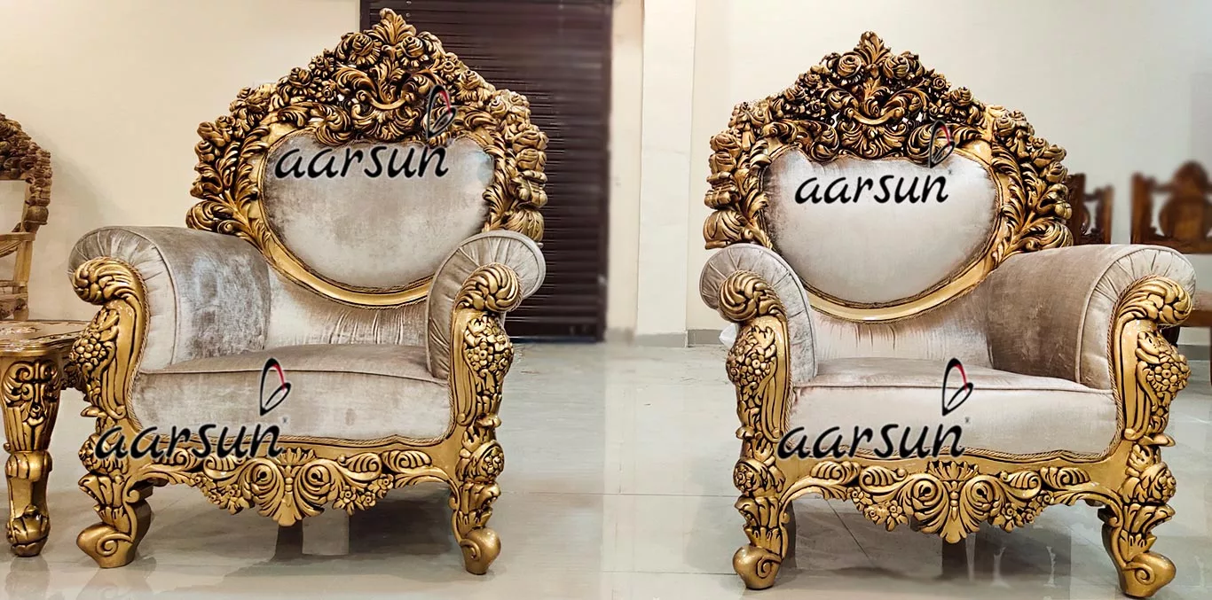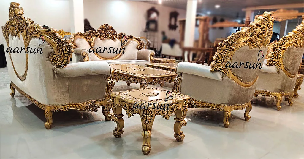 Aarsun has a very unique collection of handcrafted furniture sets that can be customized as per your requirement. Design, Color, Polish, and fabric – every aspect of the Furniture can be changed to suit your requirement. The Antique Gold Paint in 8 Seater Sofa with the Premium Fabric and artwork on the quality wood give your home interior a Royal Look and Feel.