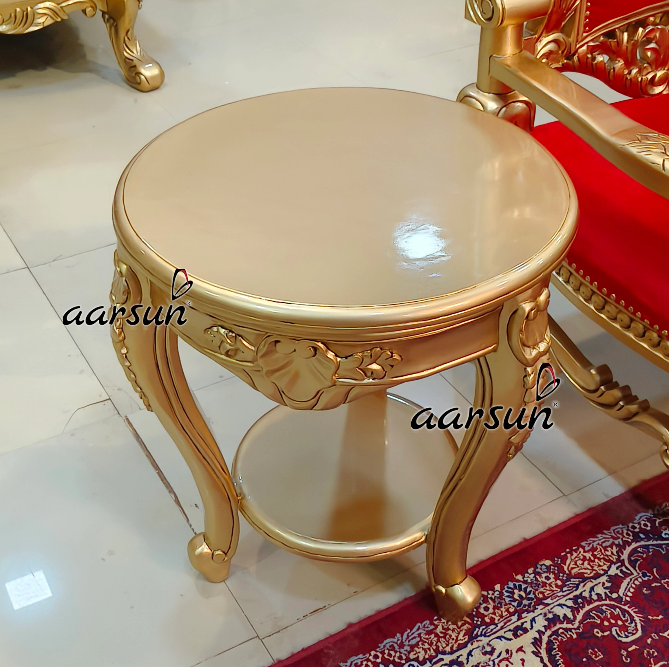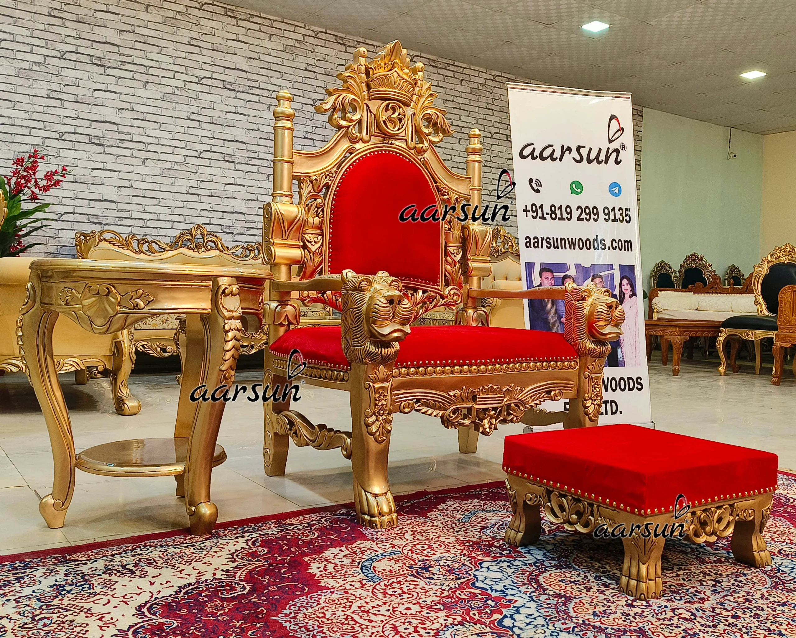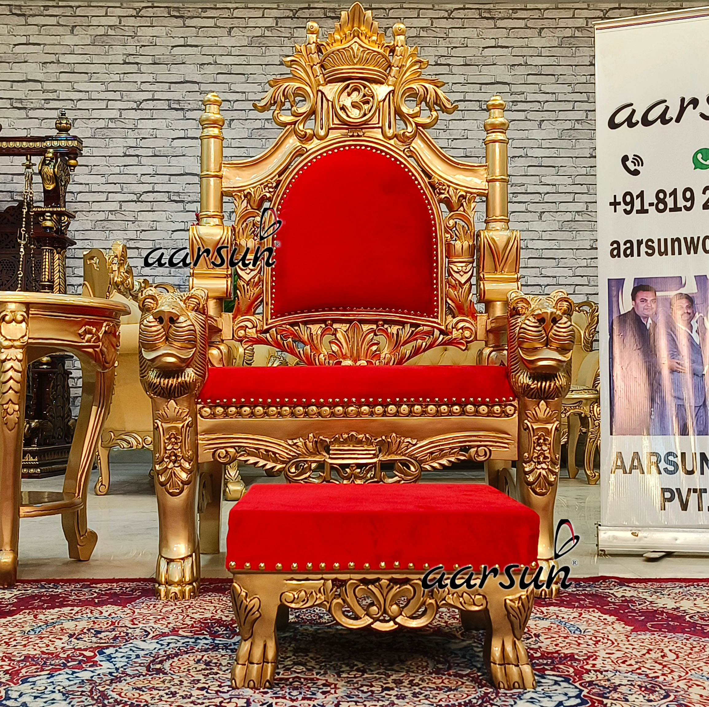 Aarsun presents an Antique Guru Ji Chair with lion-design handles. This Guru JI setup consists of a Guru JI Chair, and Paduka chowki, and a side table. This Guru JI chair is adorned with beautiful hand carvings. The Guru Ji Chair is in Antique gold paint, making the carved-out designs more appealing. The chair is adorned with beautiful carvings, the Om symbol at the top, and lion carved-out handles. This Guru Ji Chair looks royal in design. Mahakumbh 2025 is around the corner and this Guru JI Chair is an ideal choice to honor Spiritual Leaders- Mahamandaleshwars (Mahant ji ).