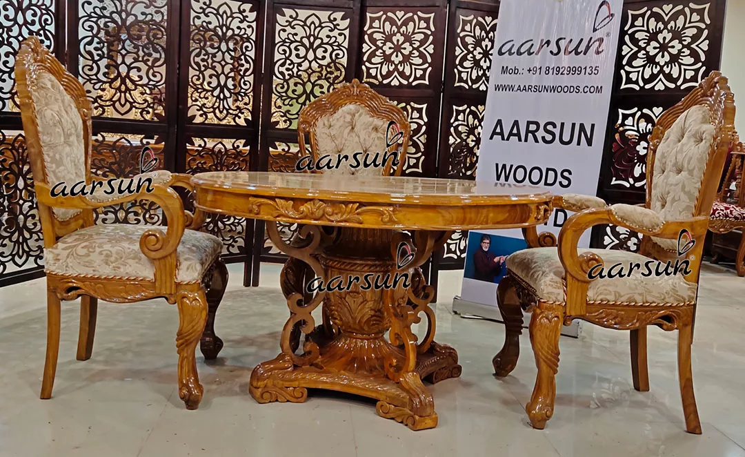 Aarsun presents to you a handcrafted Wooden Dining Set 4 Seater in premium quality Teak wood by skilled artisans. A transitional style dining set that features a round dining table, and four chairs with Beautiful fabric. It is finished in Natural polish for a dazzling appeal. The dining chairs look beautiful and make this dining set unique. The dining room set features a really attractive design. It’s a beautiful addition to the dining room area.