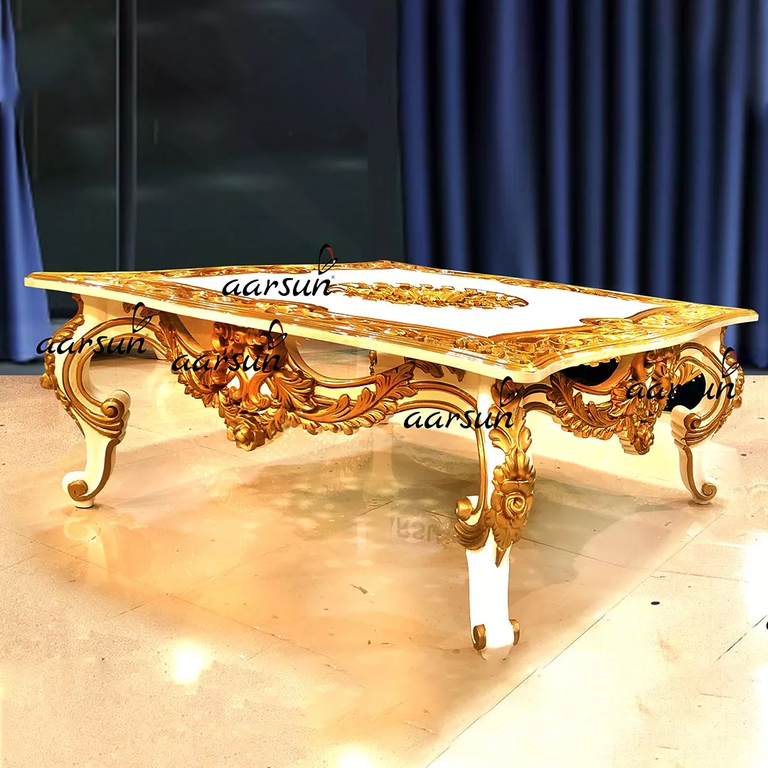 At Aarsun, we provide a personalized furniture-buying experience to every client. And this is an exquisite example of the same. The Royal Beautiful Carved Center Table Teak Wood in White & Gold with mesmerizing hand carving on thick Teak wood as the base is definitely an outstanding example to witness the woodworking techniques of Artisans in our city, Saharanpur – the Art of India.