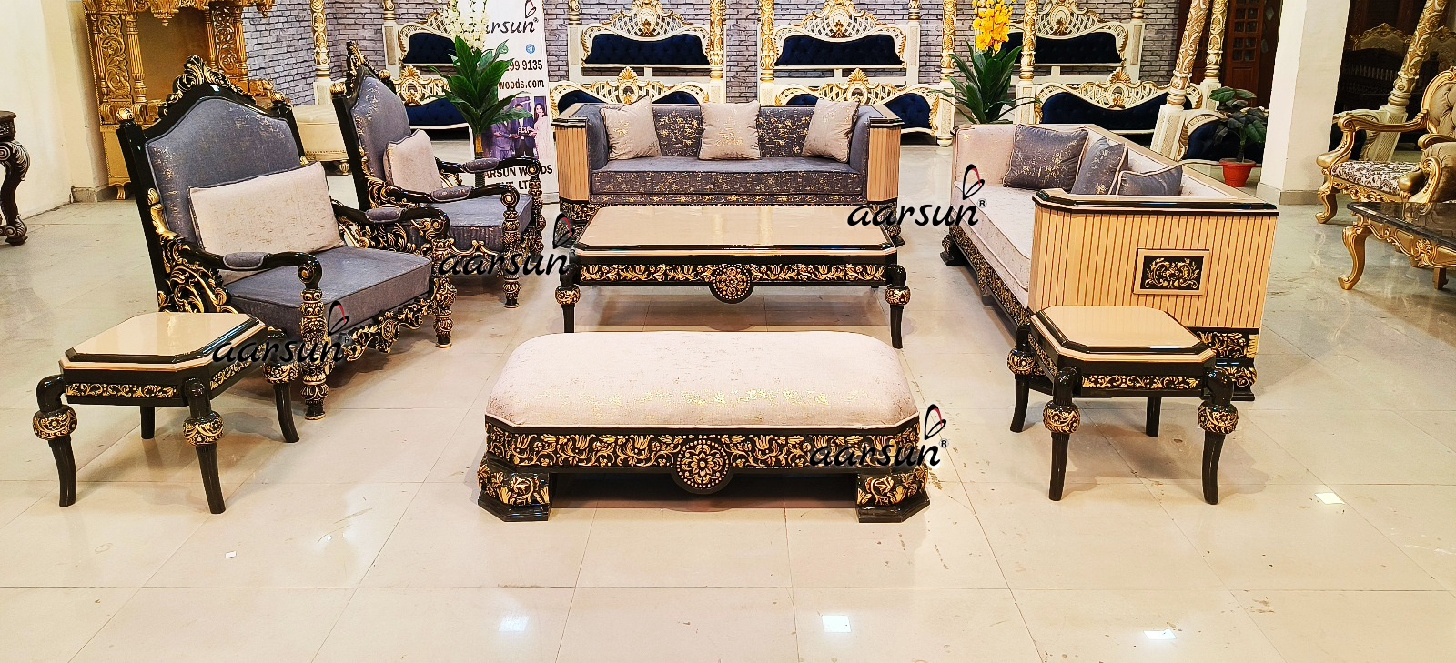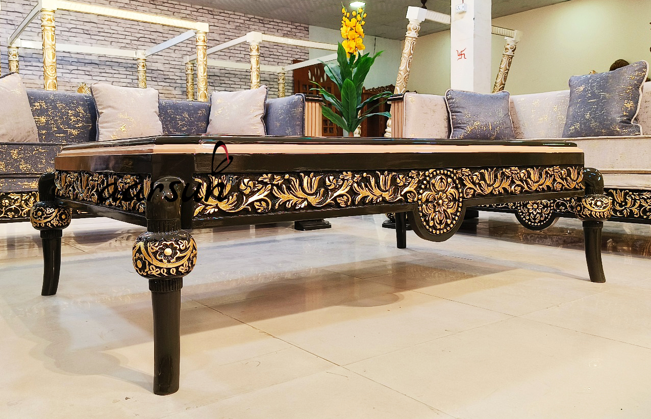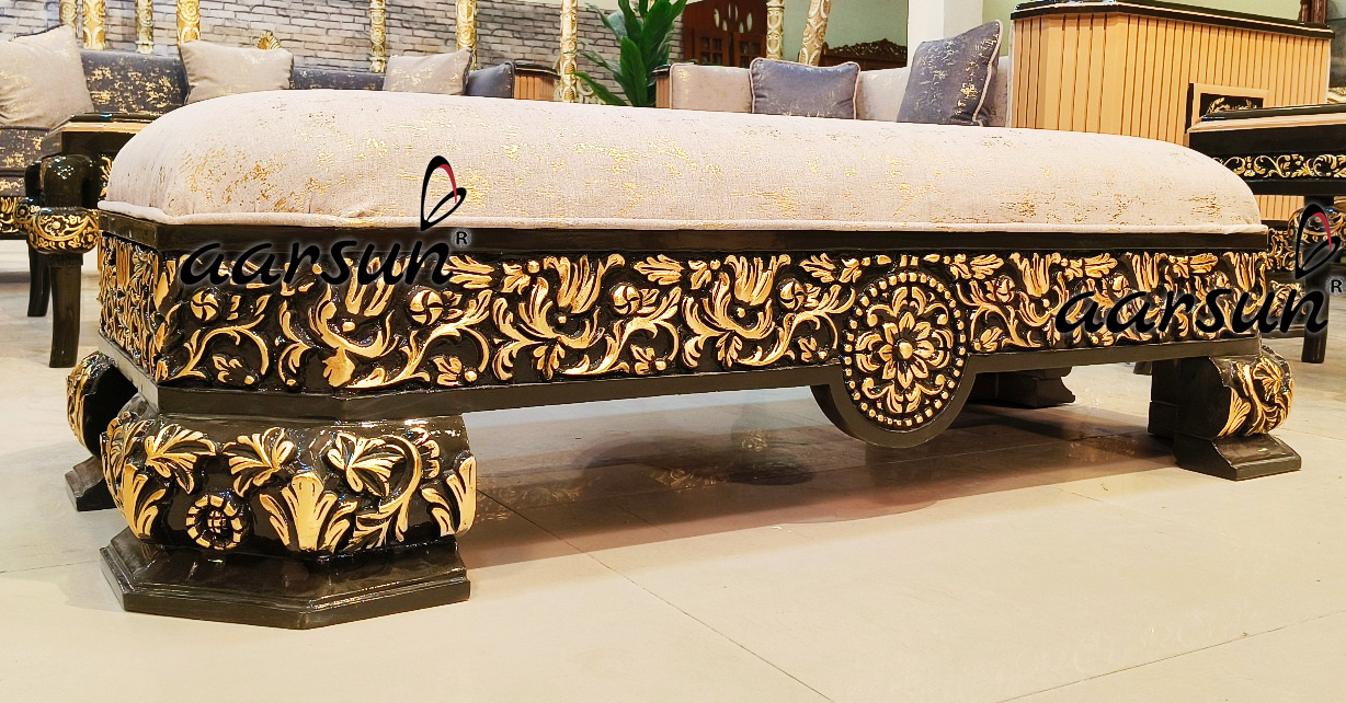 Explore Aarsun’s masterpiece sofa set crafted from premium quality teak wood. The masterpiece sofa set comprises two 3-seater sofas, two sofa chairs, an open-back settee, a center table, and two beautiful side tables. The base color of this modern yet classical design is black, with antique gold leafing highlights, showcasing the skillful art of our craftsmen.