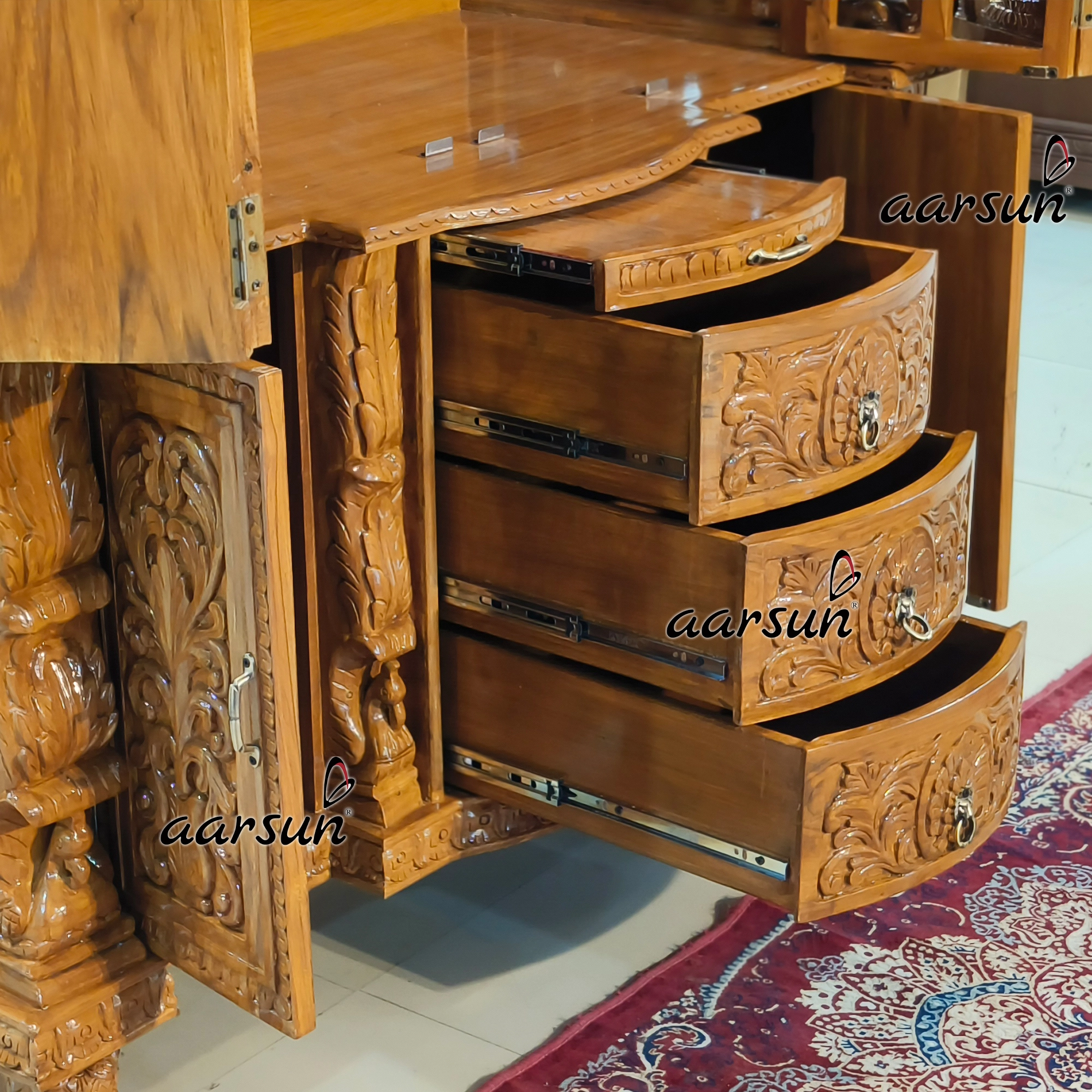 Aarsun presents Big Temple with Ashtalaxmi design doors adorned with brass bells that look unique and ideal for spacious pooja rooms and worship halls. For all the ISKCON devotees looking for a unique wooden temple, this wooden temple top is in ISKCON style with the power of auspicious bells and eight forms of Laxmi will be an ideal choice. This temple will bless your home with divinity. The temple is a perfect choice for big pooja spaces, Satsang gatherings, and Ashrams where large idols can be placed in Garbhagriha. The foldable doors serve functionality with a spacious Garbhagriha space for placing idols. For keeping pooja essentials, this temple has two storage cabinets, three pull-out drawers, and a bhog tray for offerings. The whole temple rests on an elephant-shaped base because of its significance in providing strength and support.  Made with premium quality Teak wood, this temple is strong and durable. Any customization you want can be done as per your choice because Aarsun Woods is a well-known brand for making” Choice Wala Furniture.” A brand that understands your pooja traditions and designs temples accordingly. There are a variety of Iskcon-designed temples available on our website that are Vastu-compliant.