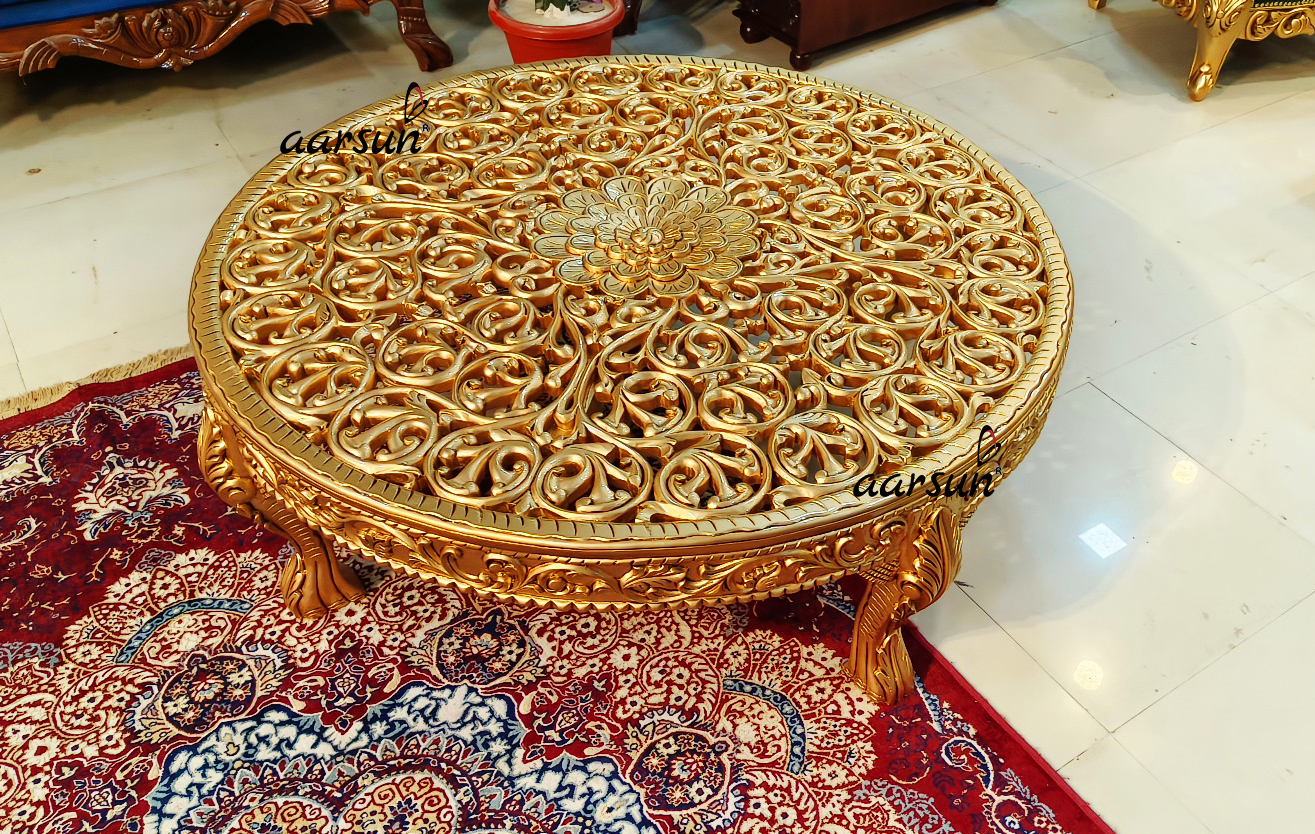 The carved circular coffee table is beautifully crafted by our skilled artisans in solid teak wood, it is not machine made. Initially, the carved circular coffee table is hand-drawn on paper and then carefully cut into the wood by hand using a chisel and a small hammer. The unit is polished in antique gold paint, the cuts easily visible in the antique finish, this is the specialty of the antique polish. The table’s top is intricately carved, requiring a glass for placing items.