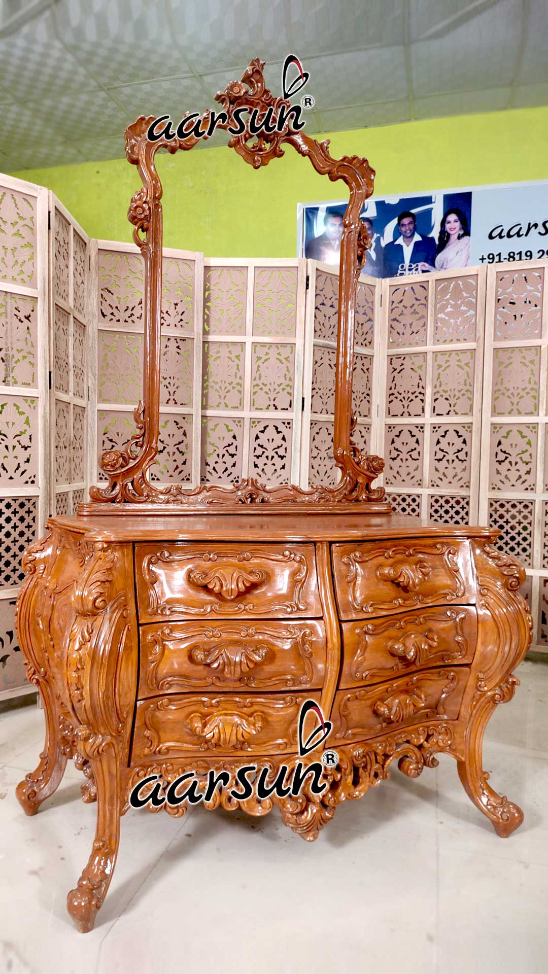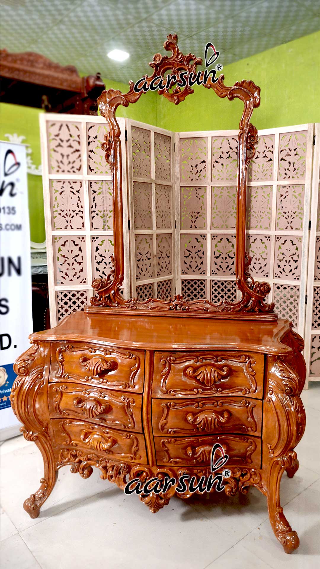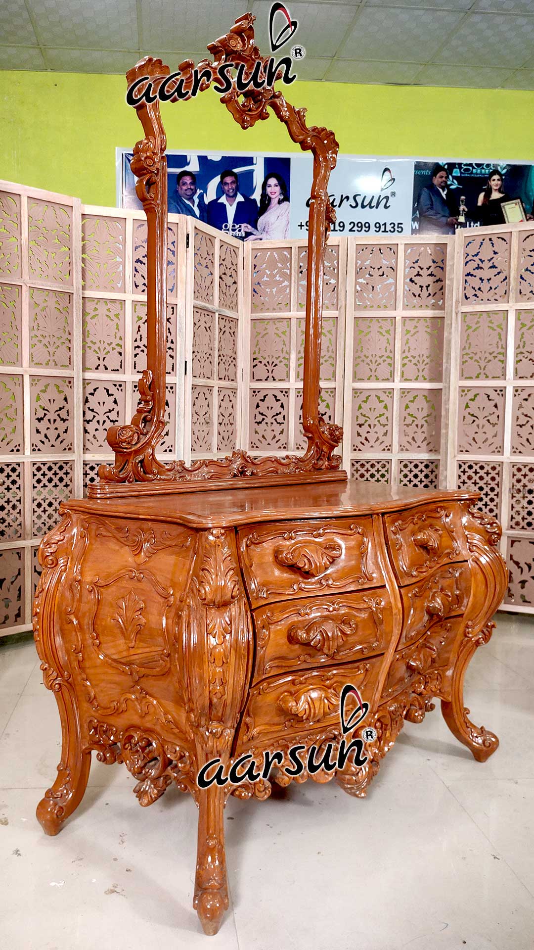 Classic Designs are Forever. At Aarsun, we always try to provide what you want at home. We do not force something that does not feel right to you. A Luxurious Classical Victorian Dresser that entirely brighten-up up your bedroom in a royal manner. The Dresser is handcrafted by artisans from Saharanpur using chiseling tools and no CNC Router. The vanity/makeup table has beautiful curve handles which look equally amazing.