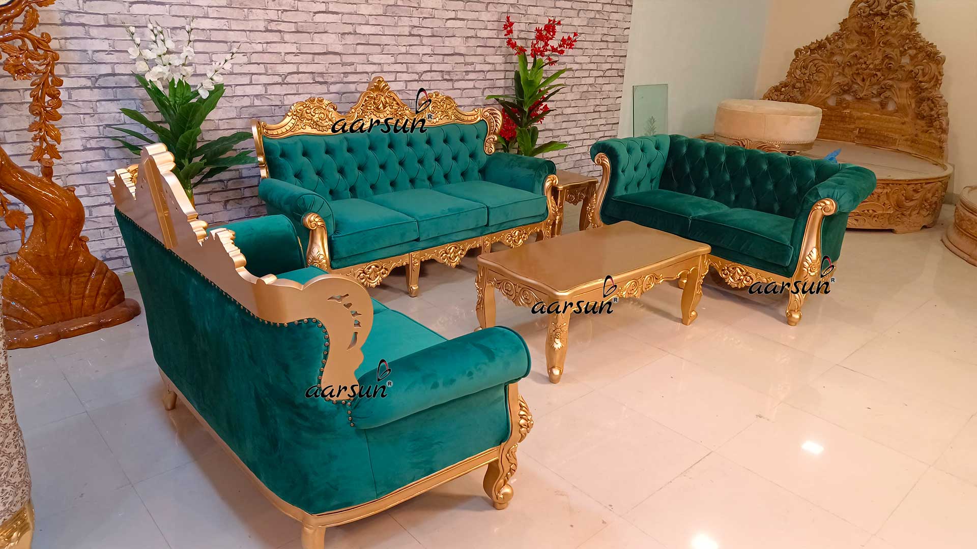 Green Chester style teak wood gold paint sofa set with table Aarsun Woods