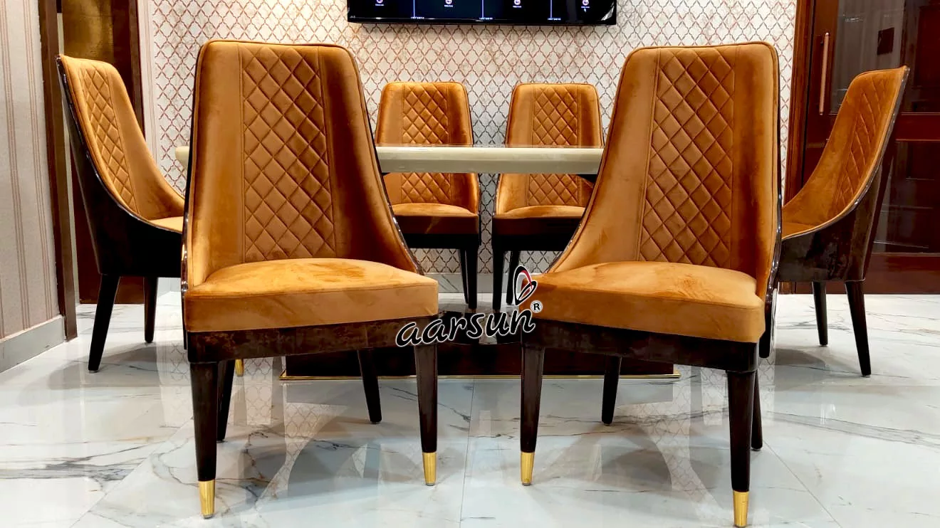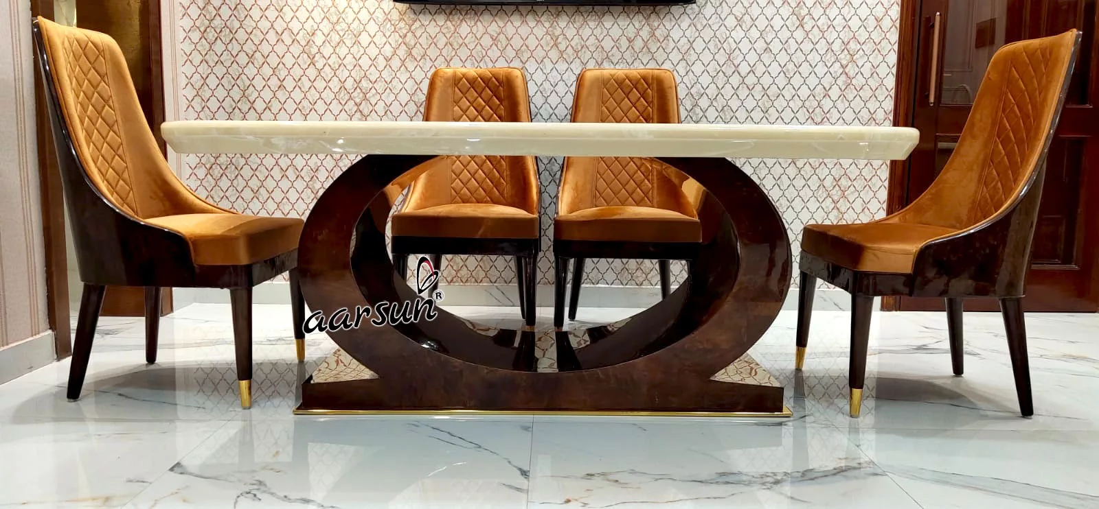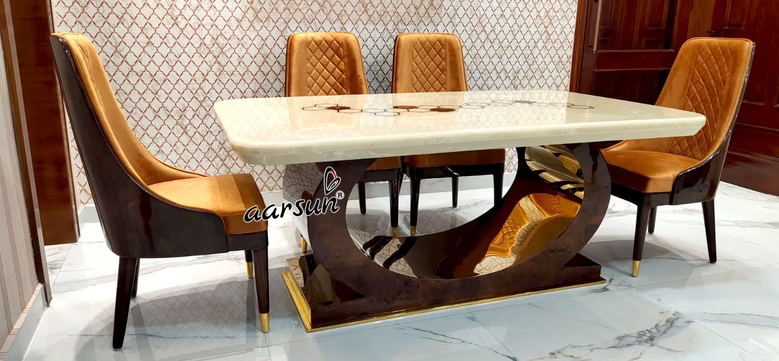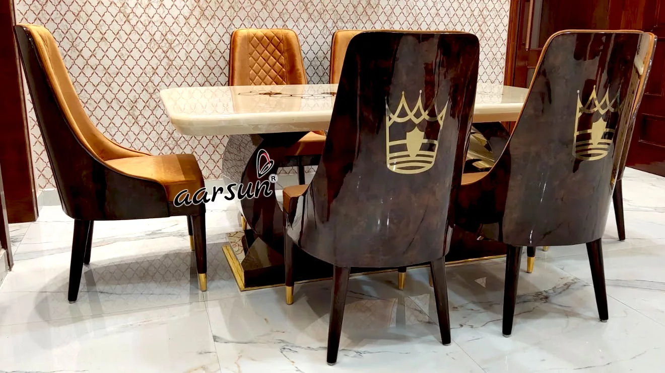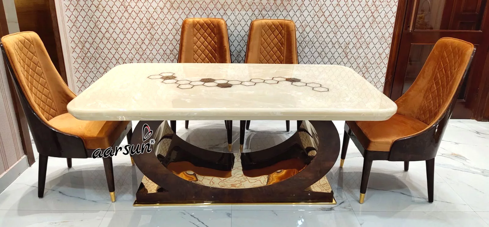 A Modern Marvel – 6 Seater Dining Set that will always stand out at home. The design is a combination of fine-grade Onyx and premium quality solid wood. The inlay work on the chairs as well as on the dining table top gives this unit an additional luxurious feel.