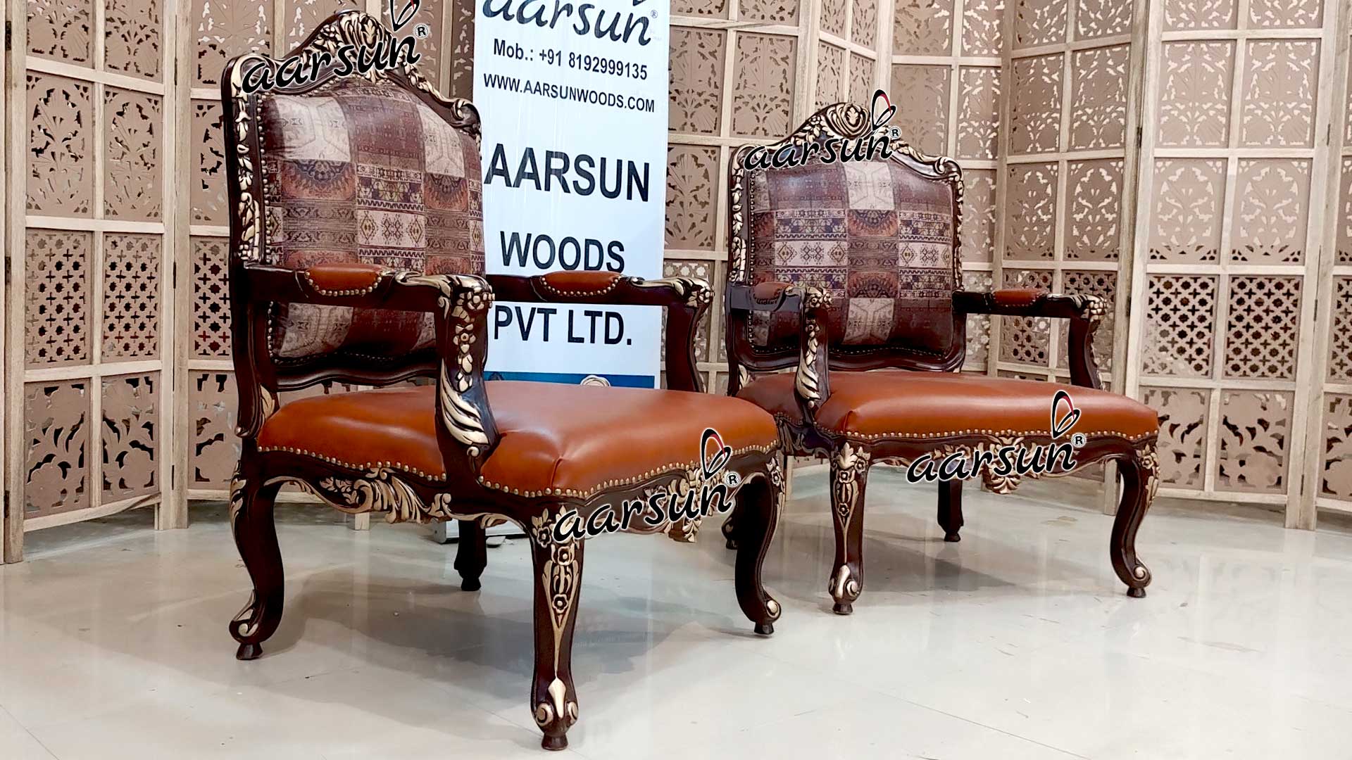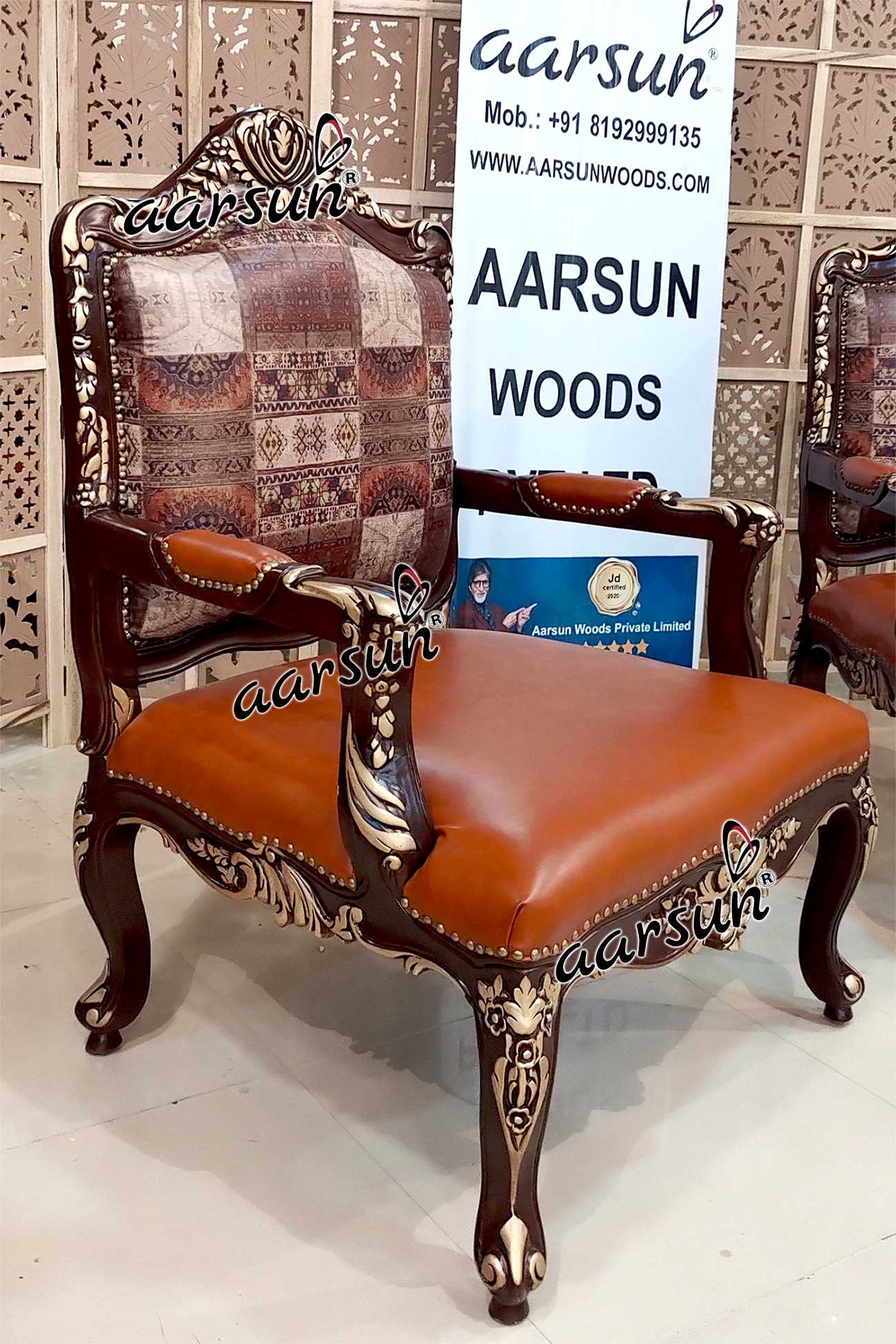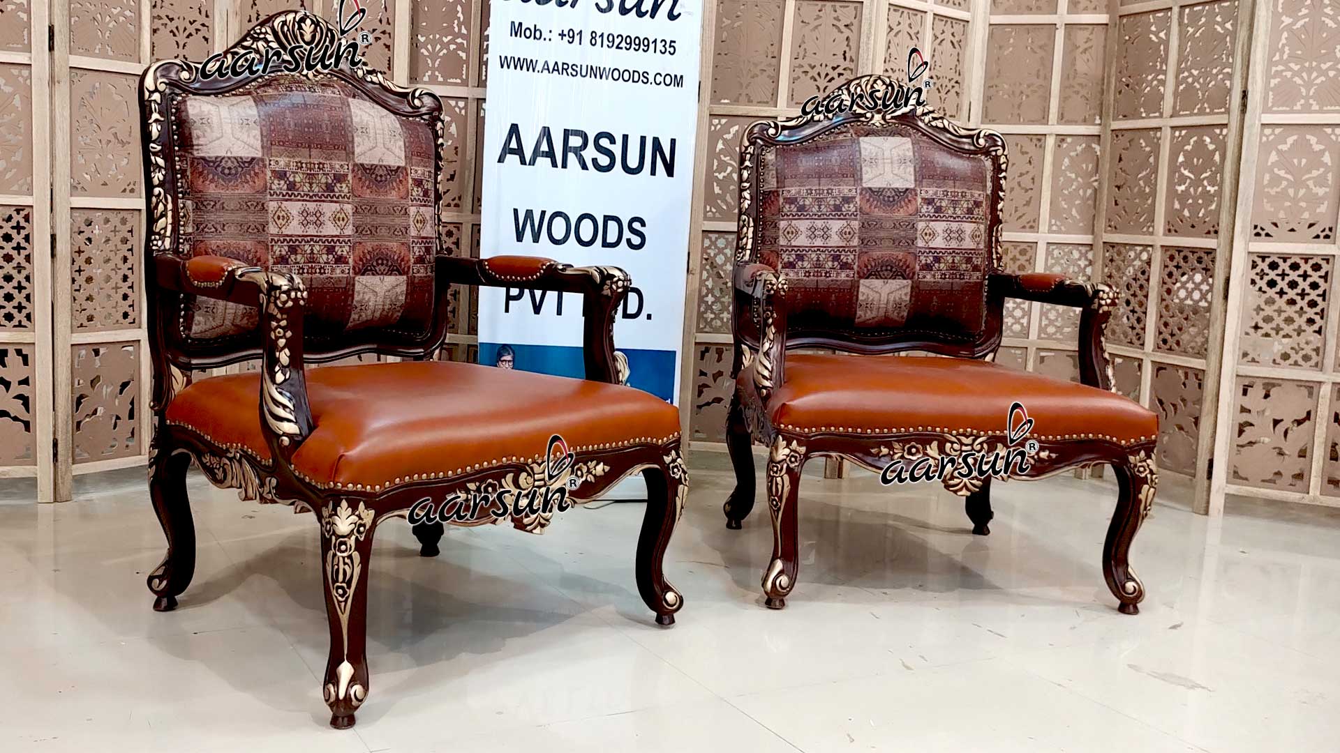 Upgrade your home furniture with these beautiful one-of-a-kind Designer Chairs in Leatherette made by skilled artisans in Saharanpur, India. Aarsun has a wide range of designer chairs that brings style to your home. The traditionally handcrafted Chair set has intricate floral carvings, semi-cover hand rest, and beautiful pattern fabric. The unit is made in premium quality Teak Wood (Sagan/ Sevan).