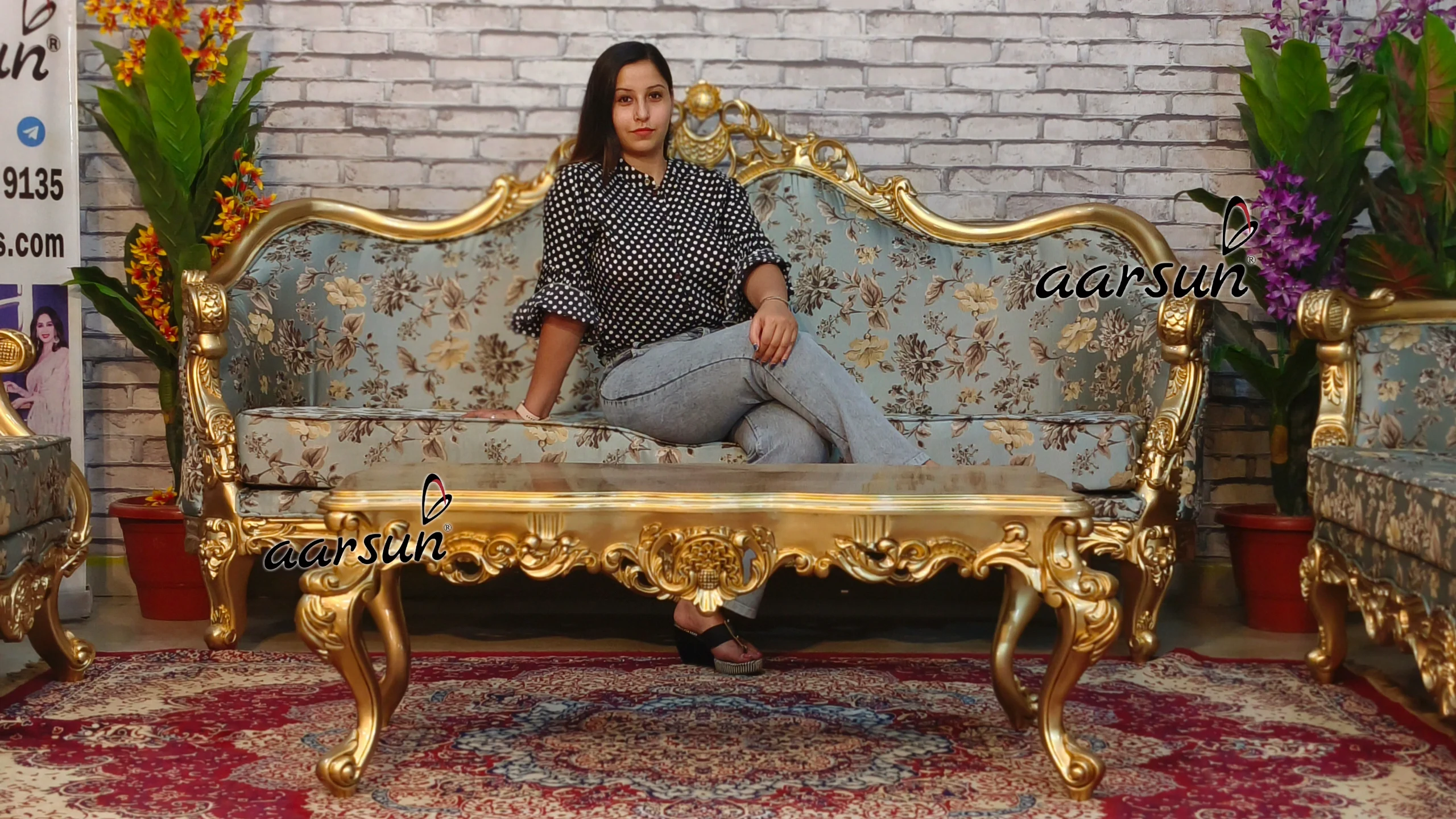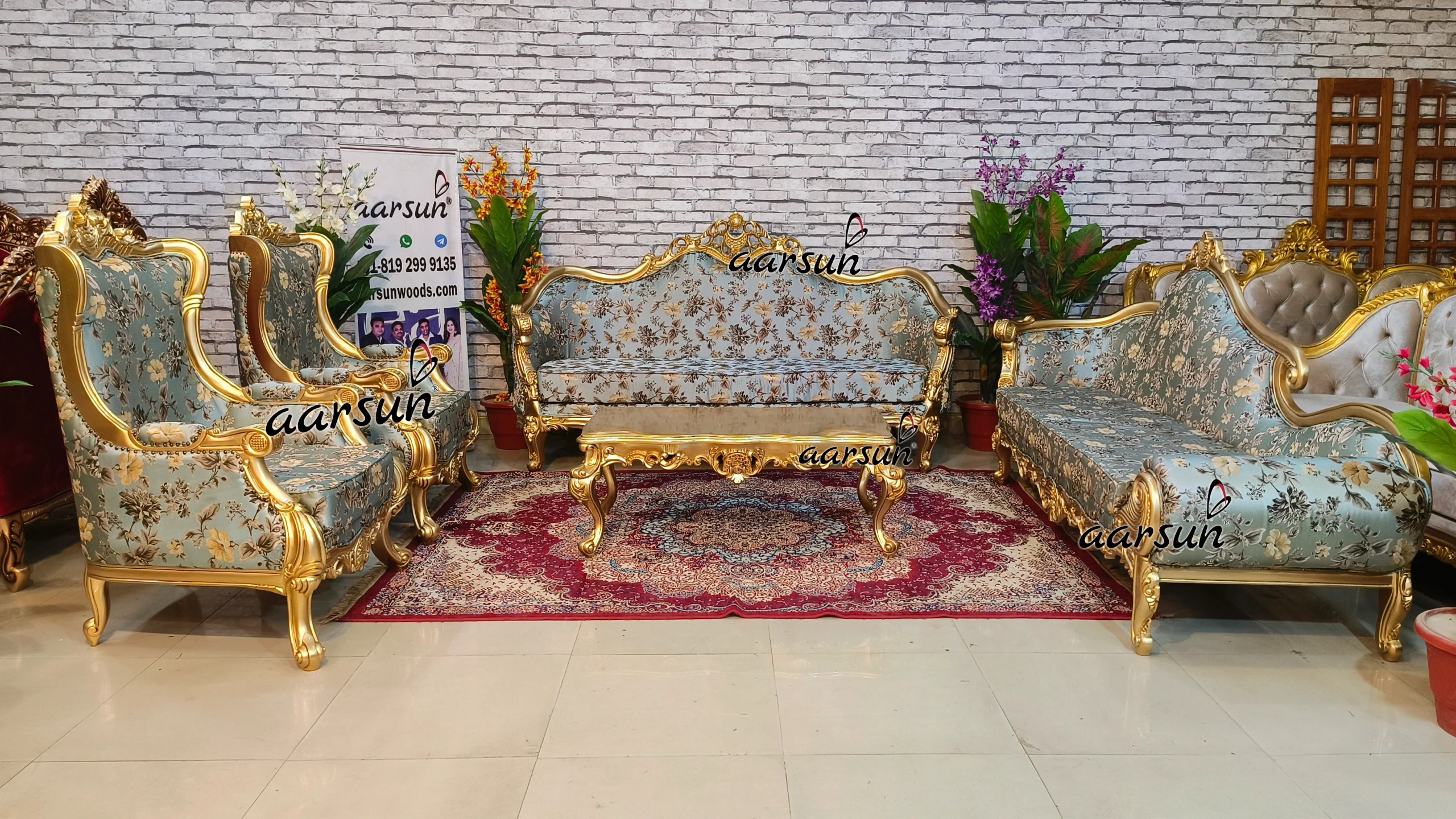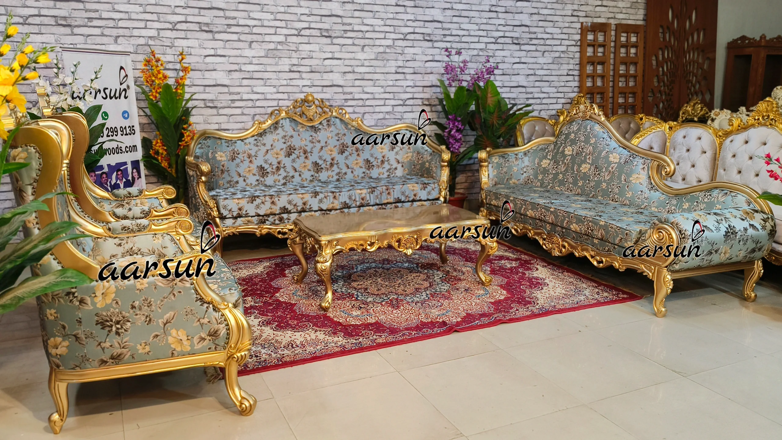 This designer  sofa set has floral cloth material with luxurious gold finish , which makes the entire set  more royal and lavish. The beautiful hand carving done on it is very precise and unique. The center table add extra charm to the overall set and if you wish you can add more elements according to your choice.