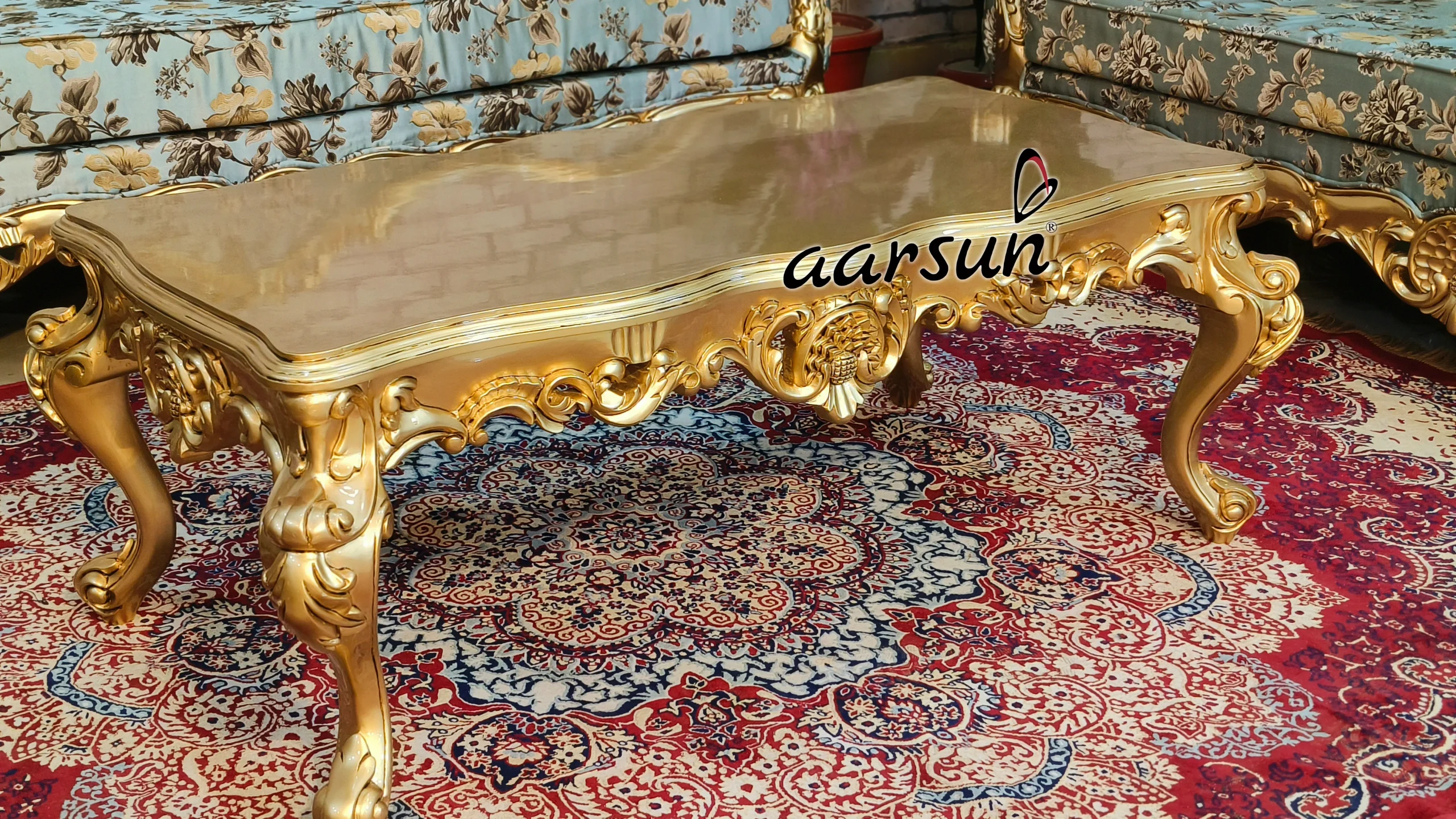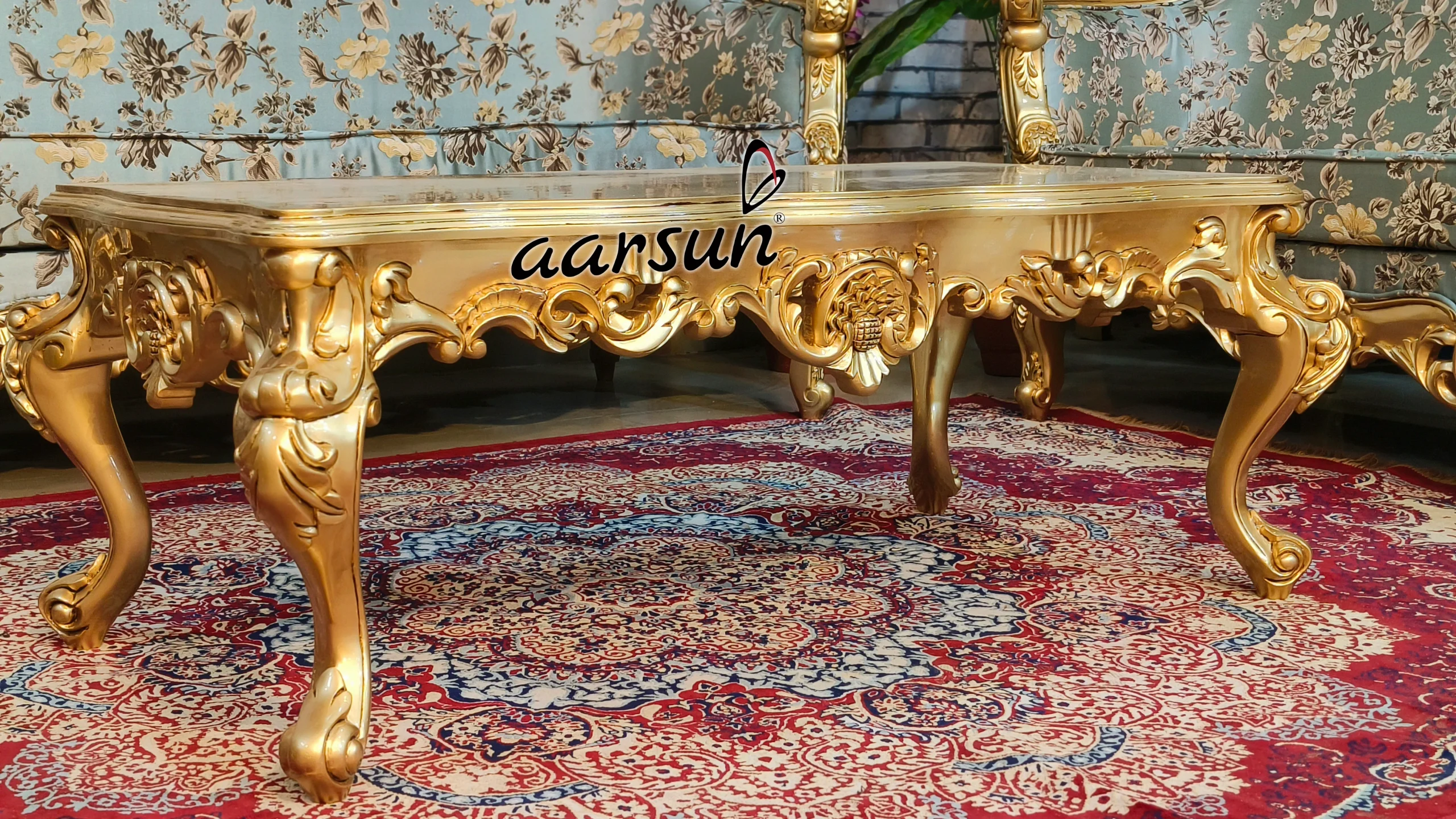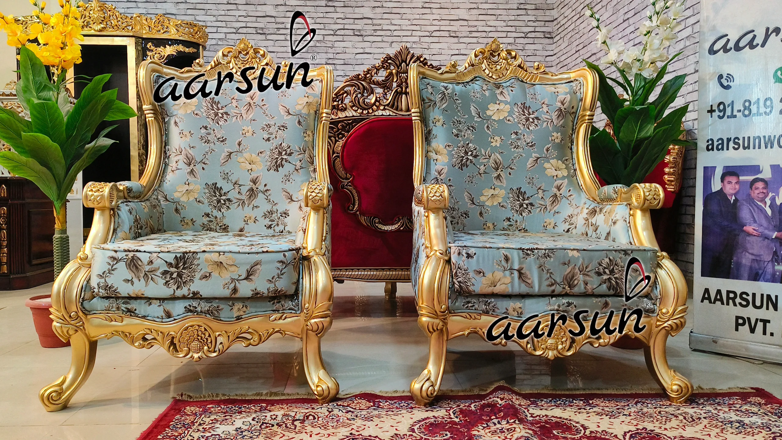 This designer  sofa set has floral cloth material with luxurious gold finish , which makes the entire set  more royal and lavish. The beautiful hand carving done on it is very precise and unique. The center table add extra charm to the overall set and if you wish you can add more elements according to your choice.