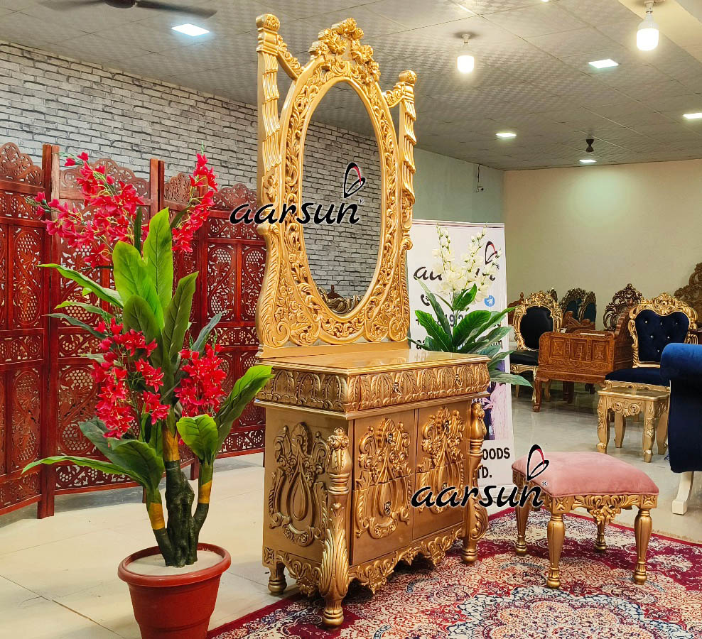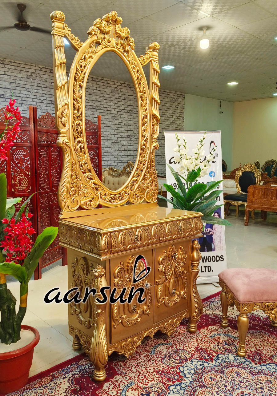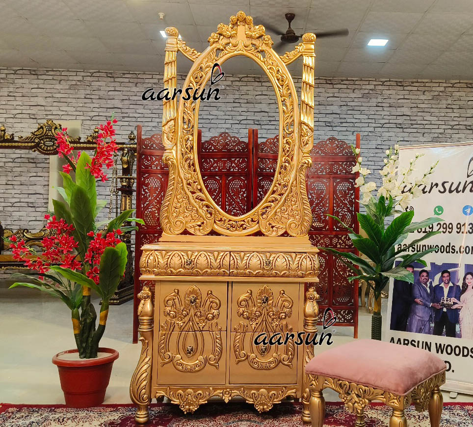 Aarsun brings you a beautiful Elegant dresser that will add a touch of royalty to your bedroom decor. The dressing table has oval-shaped mirror frame in gold finish. This gorgeous Elegant dresser offers plenty of storage space with its six pull-out drawers for all your necessities. It is the ideal addition to any area because of the rich wood and lavish gold finish, which give your bedroom space a feeling of timeless elegance.  Enhance the atmosphere of your space with this sophisticated and useful piece of furniture. For more dresser designs click here.