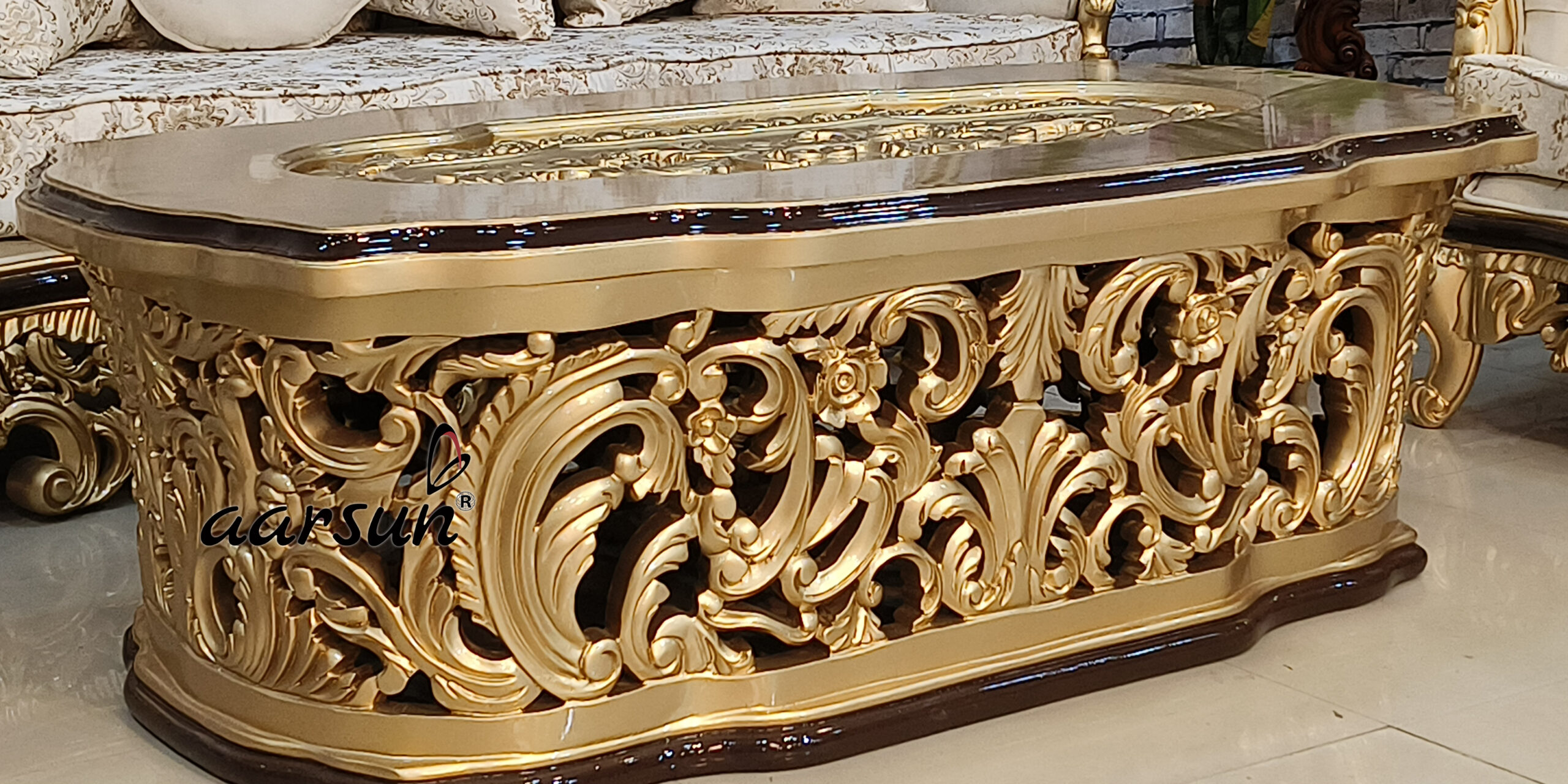 - The center table has 360-degree carvings and a carved top. Each piece is unique and luxurious