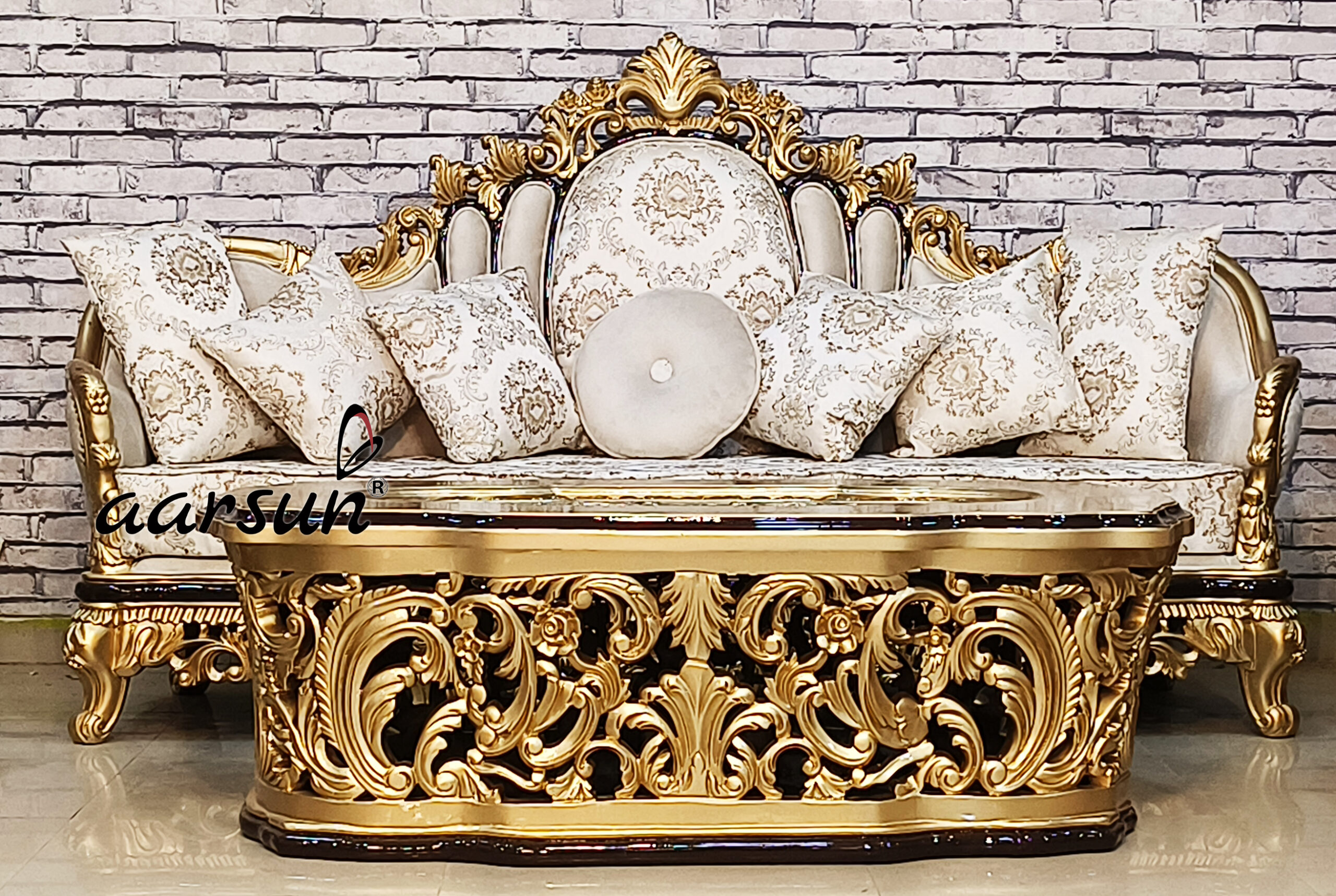 Aarsun brings you an exclusive wooden sofa set. The unit is handcrafted by our skilled artisans. People around the world will come to know the beautiful work of Indian artisans. This luxurious sofa set consists of two 3-seaters, two sofa chairs, two side tables, and a center table. The unit is designed in teak wood with gold paint and chocolate brown highlights in the middle of the furniture, as per the catalog colors. This unit follows a catalog design.