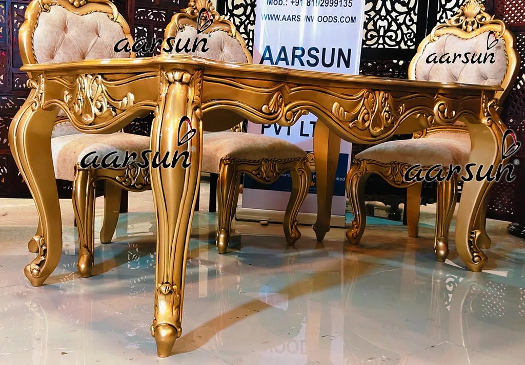 • Teak Wood WOODEN DINING TABLE in Antique Gold Finish – 6 Seater Dining Set Provided By Aarsun