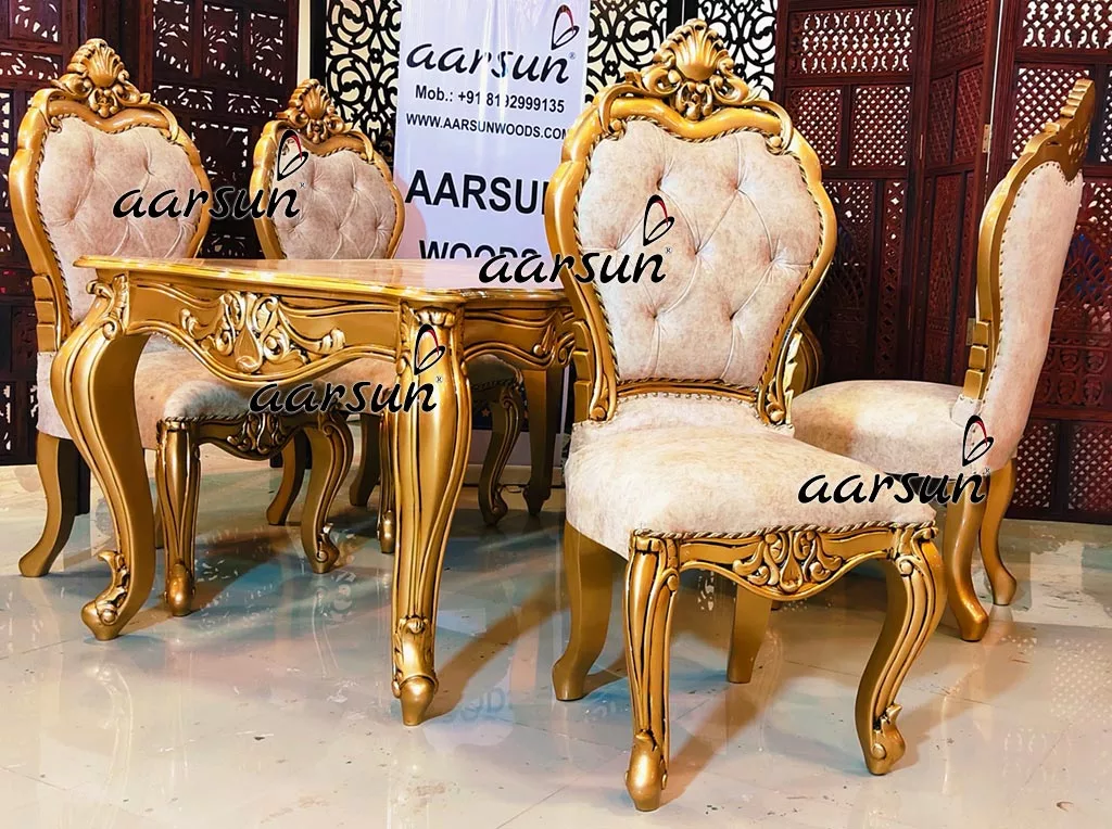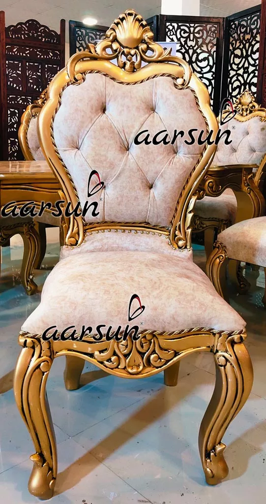 Exemplary 6 Seater Dining Set – This Luxurious state-of-the-art Antique Gold Premium Dining Set is handcrafted by skilled craftsmen in Teak Wood. Teak Wood is widely famous for its durability and termite resistance. The Table and Chair set is Gold polished beautifully. The unit is a 6 Seater Set and the fabric can be changed as per your choice.