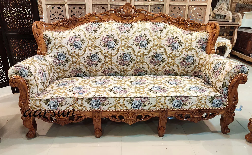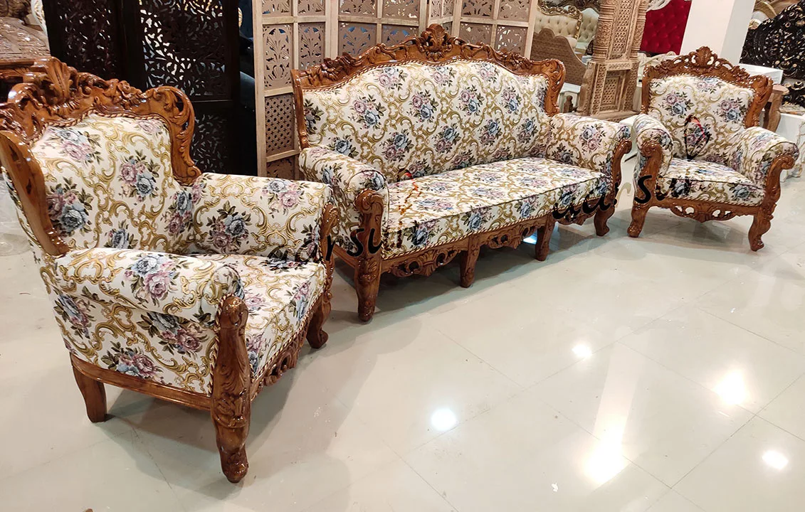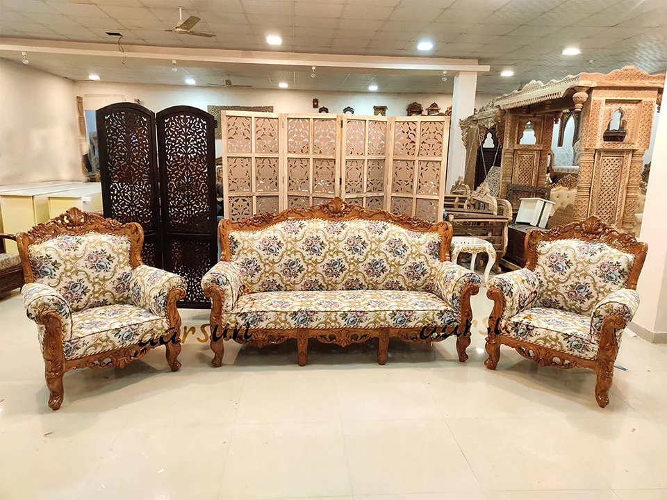 Aarsun brings to you this top design 5 piece Sofa Set 3+1+1 Set for your living room. This 5 seater sofa set is made of premium quality teak wood with beautiful hand carving by master artisans of Aarsun. It has an elegant design that enhances the interior decor of your living room with amazing natural polish colors and beautiful floral fabric pattern. When you are looking to redesign your living space, Handmade Wooden Sofa Set from Aarsun offers the top designer furniture for living room with home delivery globally made in India for the World.