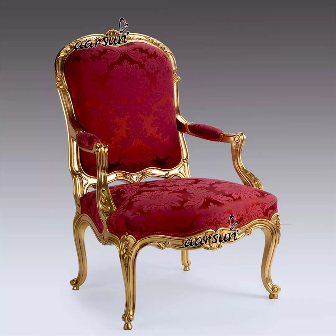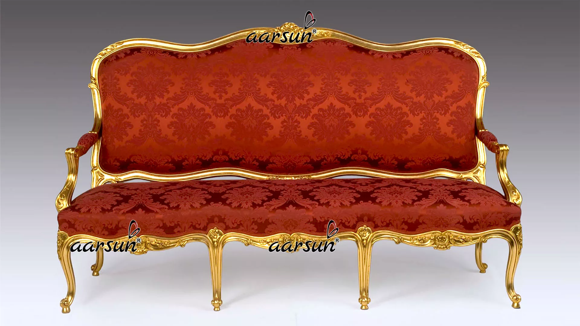 The Aarsun elegant French-style sofa has a center table and two side tables crafted out of solid teak wood finished in antique gold deco. A solution set of elegance that makes any place look and feel posh and that is especially suitable for aesthete. The Sofa set is Made with teak wood of the finest quality, this sofa set is long-lasting and sturdy. The wood is carefully selected for the highest grade quality and is finished with a beautiful antique gold color that gives a glamorous look to the entire appearance, and is designed to last for many years to come and finish off any living room with a splendid focal point.