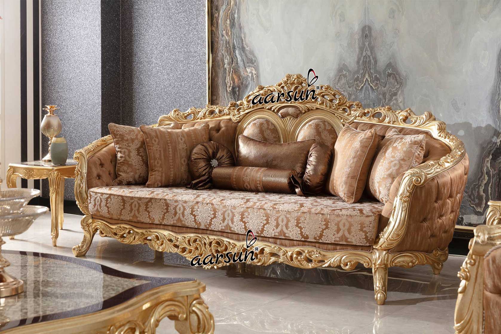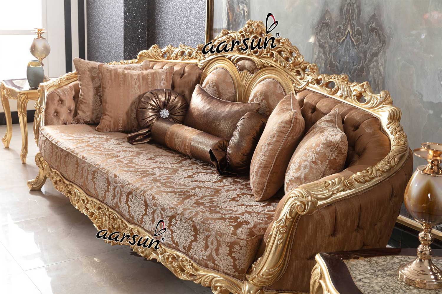 Aarsun promotes to you Handcrafted Maharaja Gold Polish Sofa Set for home. Throughout this beautiful furniture piece, you will find carvings that lend an old-world charm and elegance. The Wooden Sofa Set designs have also been modified to suit everyone’s requirements. This Handmade Wooden Nawab Style Sofa Set is made with premium quality Solid Wood.
