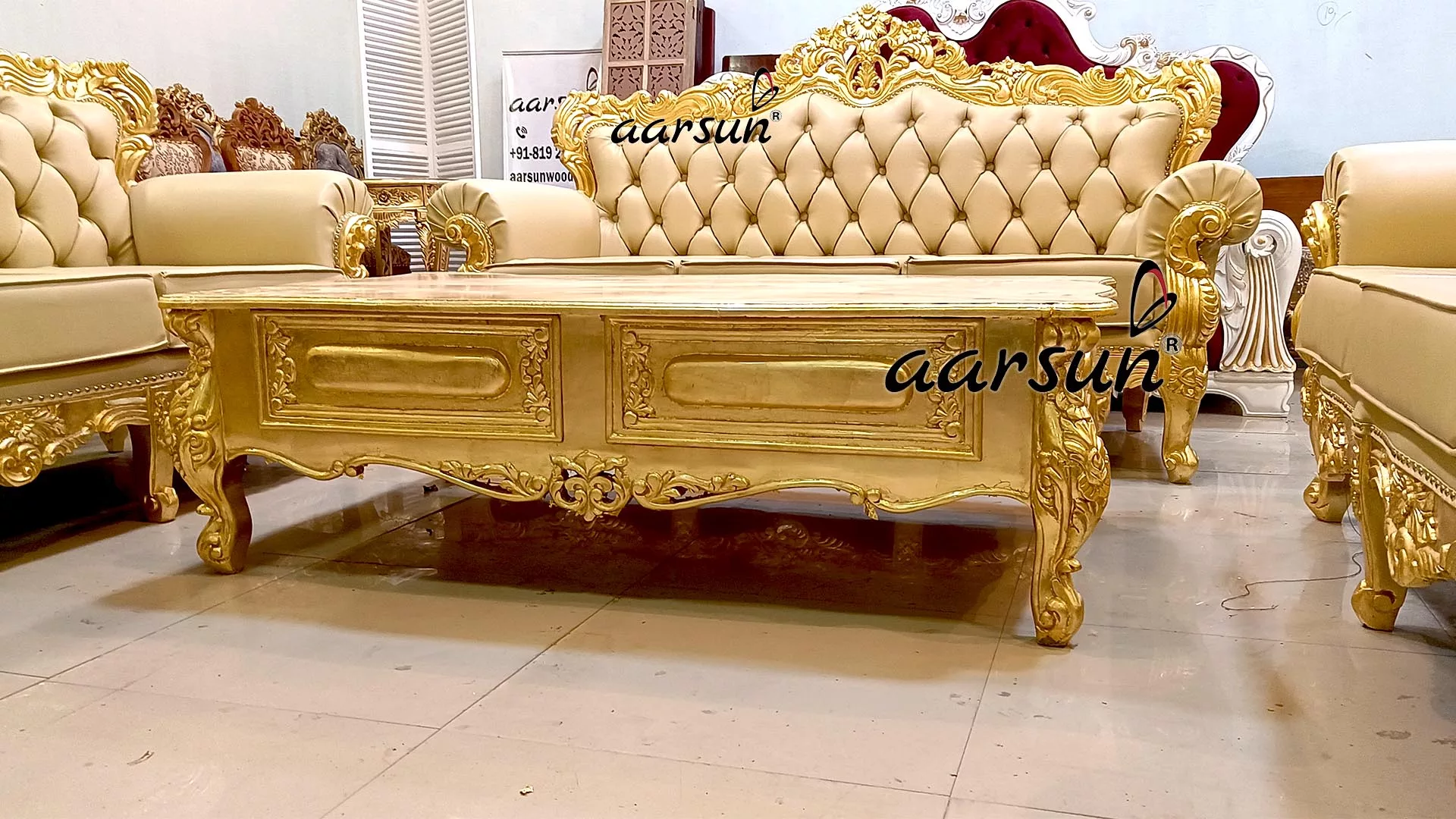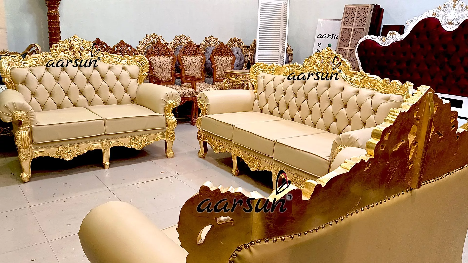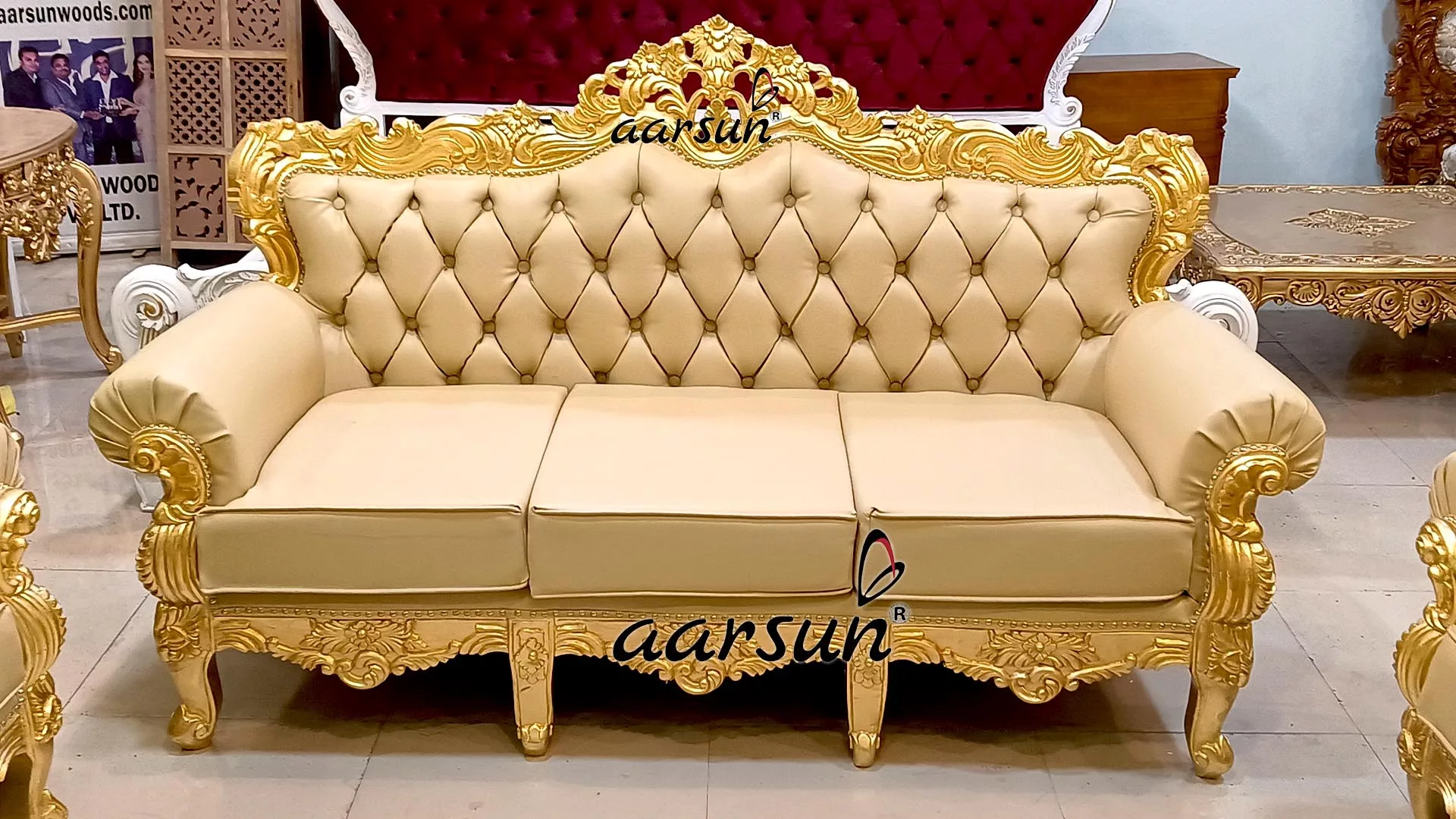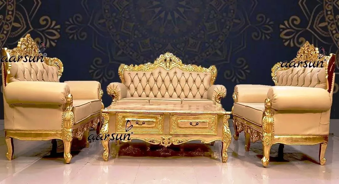 This sofa set is in Gold Leafing also known as Gilding that is the most luxurious option in Furniture. Aarsun makes furniture as per end user requirement, thus sizes, colors, designs, upholstery everything as per choice is available. Everything you see in this premium wood sofa set is unique and handcrafted as per the client’s specifications.
