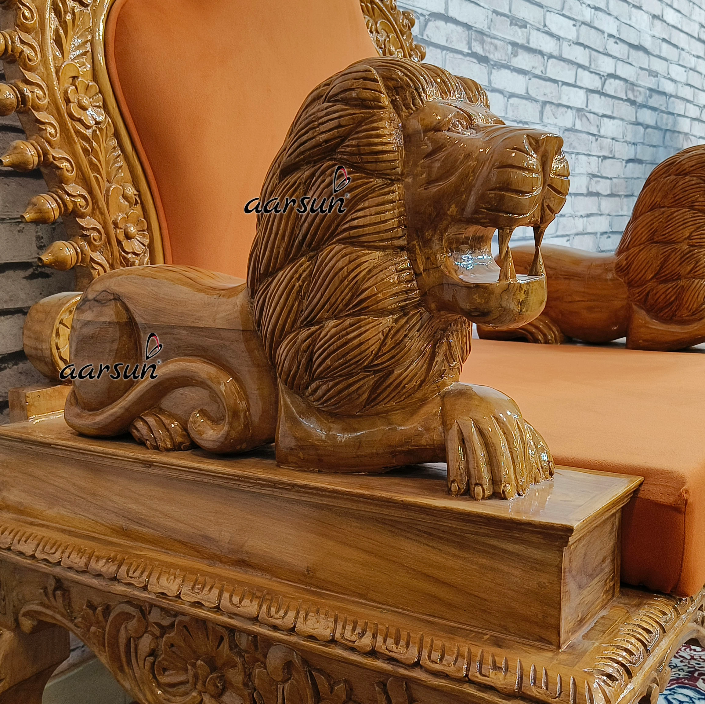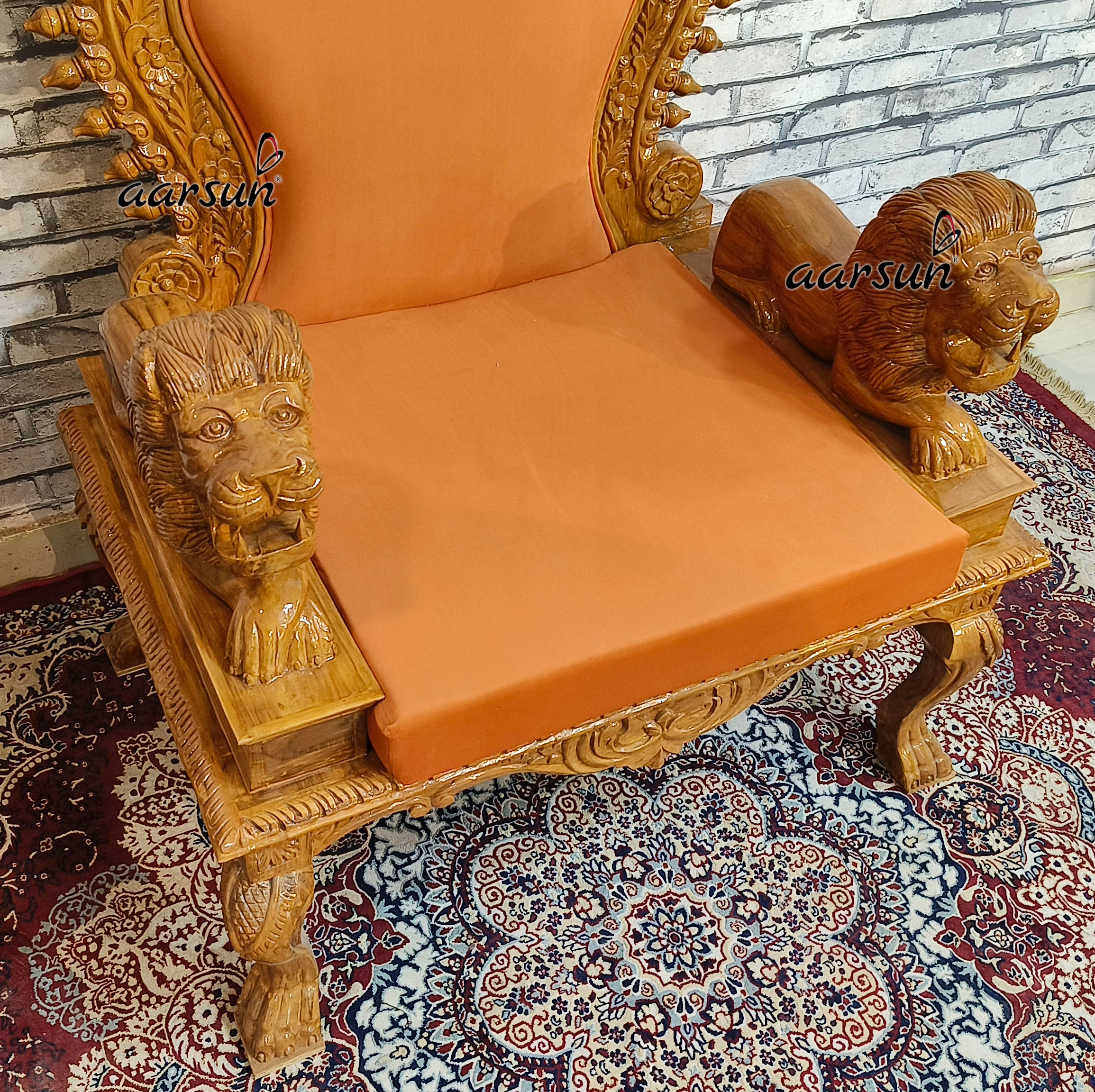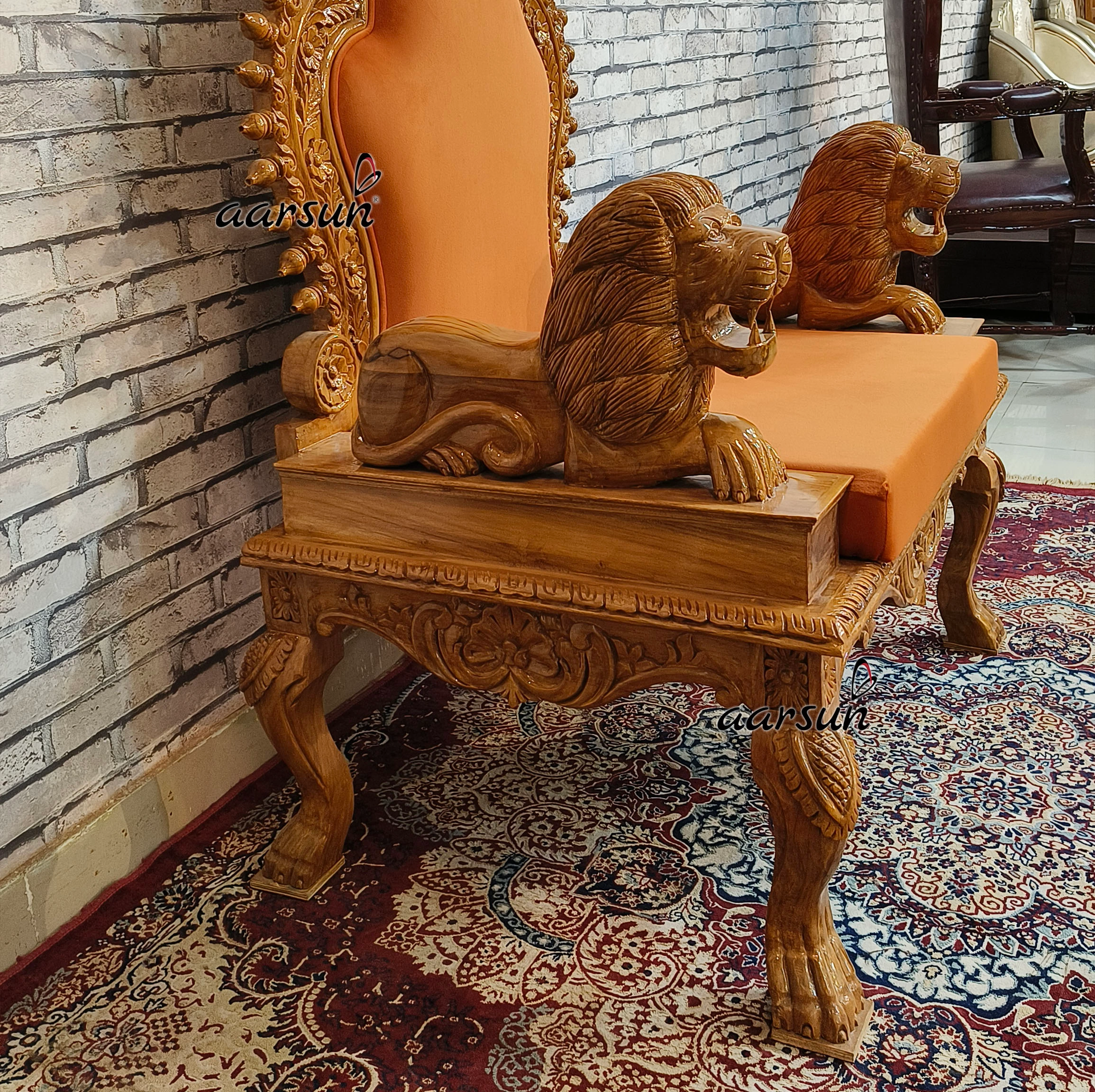 The fabric color matters a lot. In this Guru Ji chair, we see orange color upholstery complementing the wooden frame of the chair. The orange color represents energy, warmth, positivity, courage, and pride. Therefore this color is ideal for the Guru Ji chair because Guru holds a special place in devotees’ lives. This is the fully customized Guruji Sighasan. Lion face handles in front make it look so royal. The chair is in a Natural Gloss Finish.