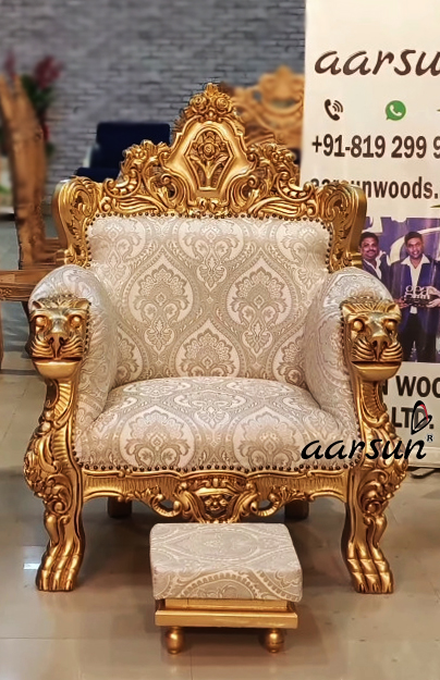 Built from the best teak wood, the chair has a teak finish, and the fabric used is selected as per the requirements of the client. Along with chair, we have the Charan Padhuka stool, always required with this. Every unit is handmade, beginning with a detailed drawing and progressing through cutting, crafting, carving, painting, quilting and so on.