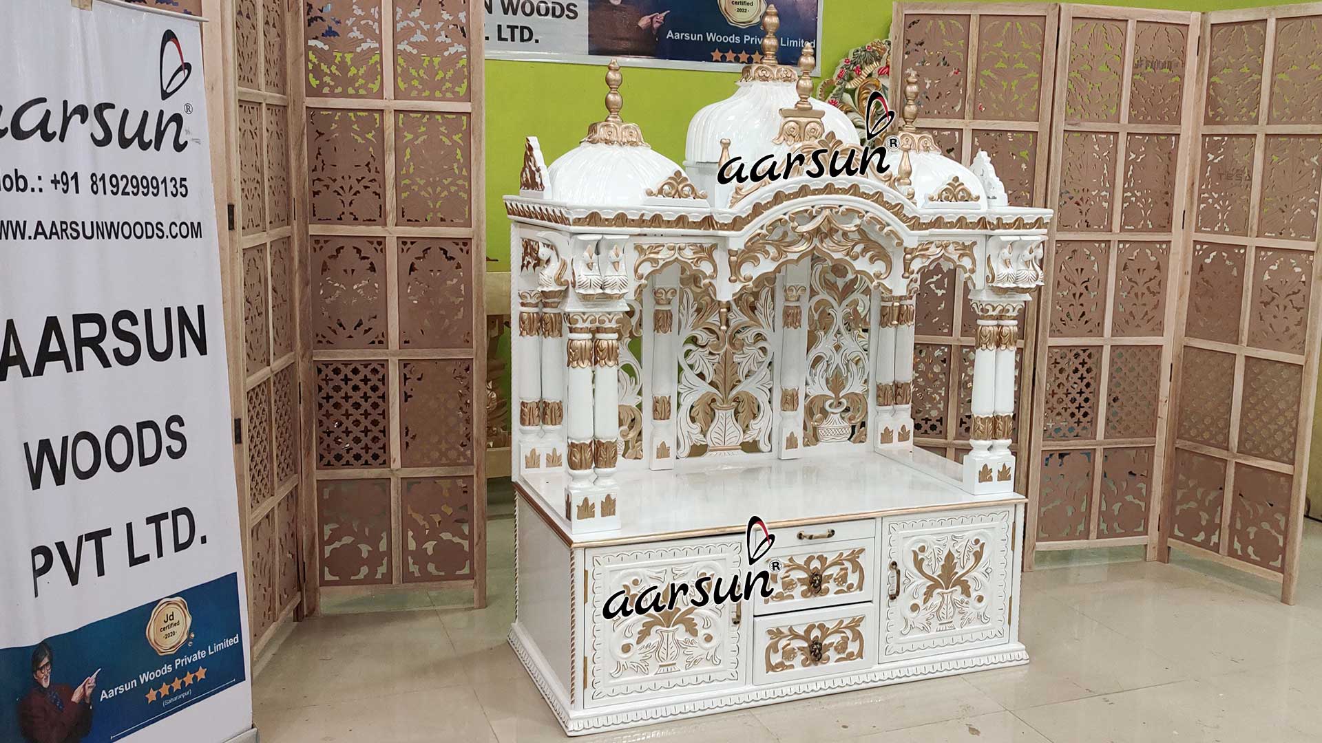 Nowadays, clubs, disco and crowdy places have become a fashion statement for enjoyment and fun but these things don’t give you true peace of mind. In search of the true piece, you do not need to go to a hill station or any spiritual place. You can be at peace at home too. You just need to have a quiet place where you can gather your thought and feel connected with the Almighty.Aarsun can help you design a beautiful Mandir for eternal peace. We have designed a Customized ISKCON Temple with white polish and gold highlight. The unit consists of ample storage area with bhog tray. The cabinet is specifically designed for worshipping in a seating position. The Gopuram/ Shikhar parts are Detachable.