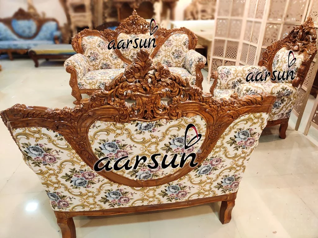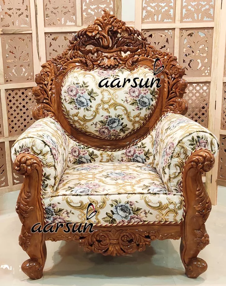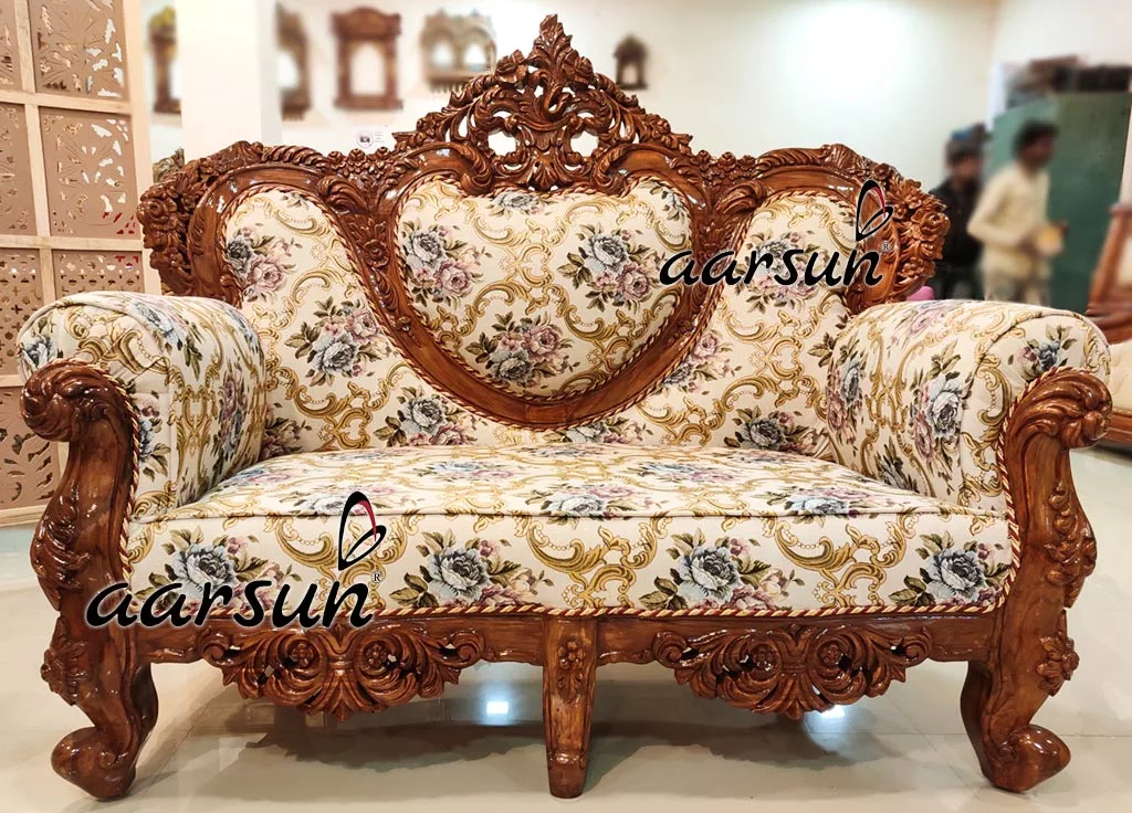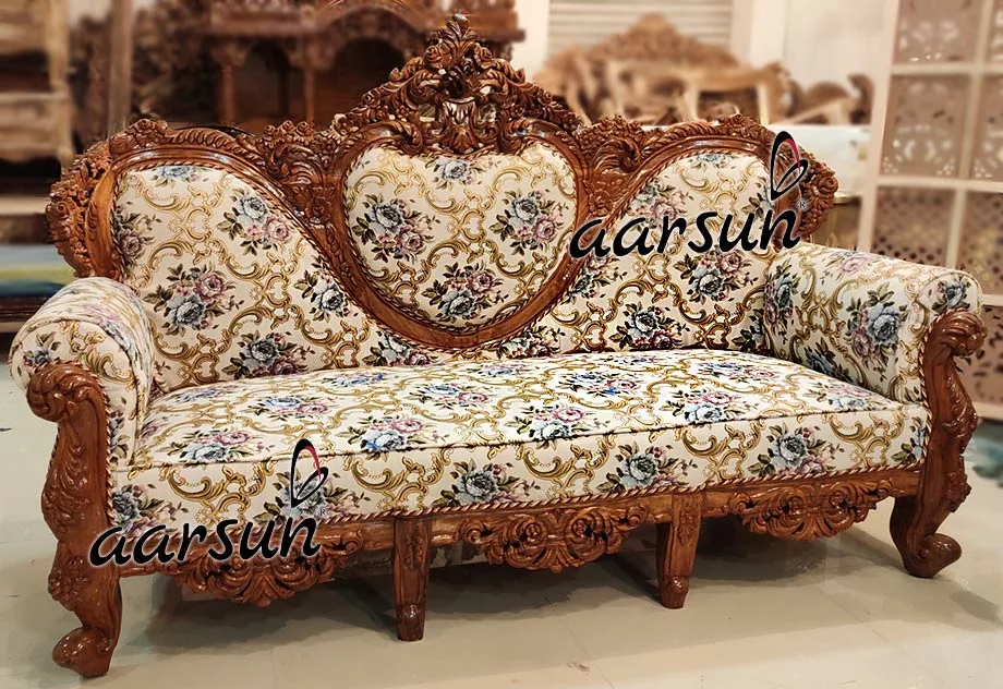 Breathtaking Luxurious Sofa Set in Teak Wood. The Traditional and sofa set carving Indian Design belonging to the classic category reflects the vintage philosophy perfectly well. The Wooden Sofa set designs have also been modified to suit everyone’s requirements. This Handmade carved wooden sofa set is made from premium quality Teak wood.