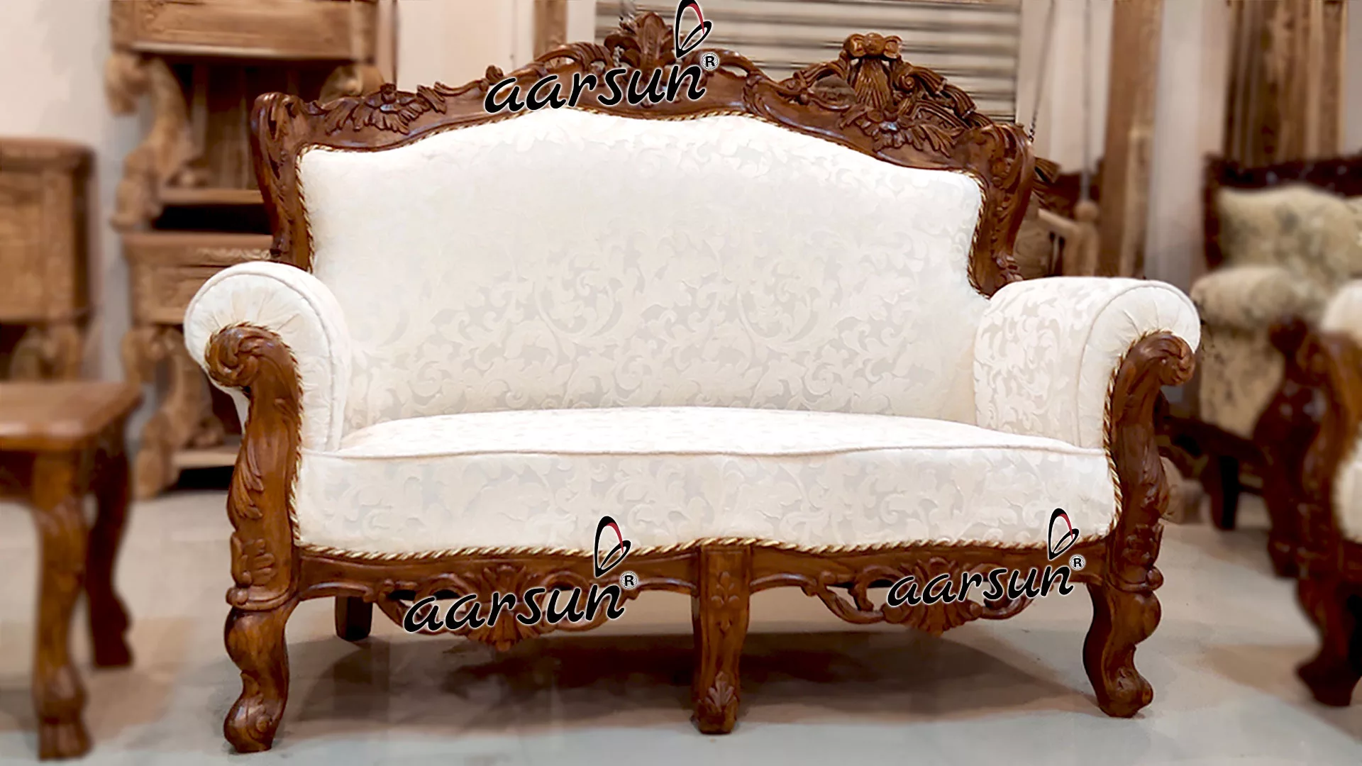 Aarsun brings to you a modern and comfortable wooden sofa set for your living room. This Sofa Set is made of premium quality Teak Wood with floral carving. It has an elegant design that enhances the interior decor of your living room. The fabric of this sofa makes it very comfortable to sit while the floral carving back gives the traditional look to the set. The unit is supported by four beautifully carved legs.