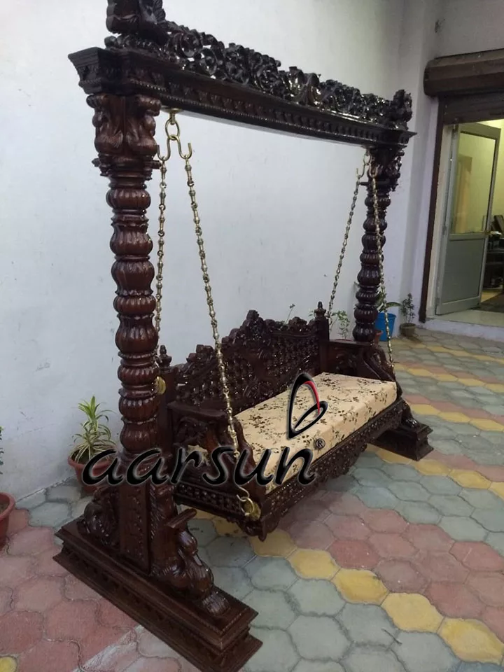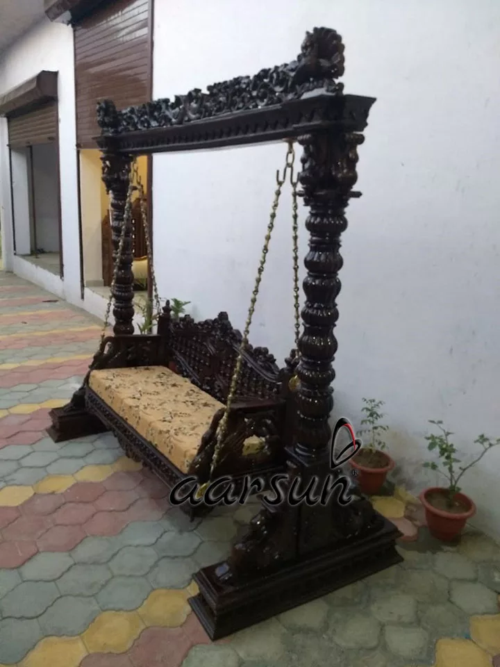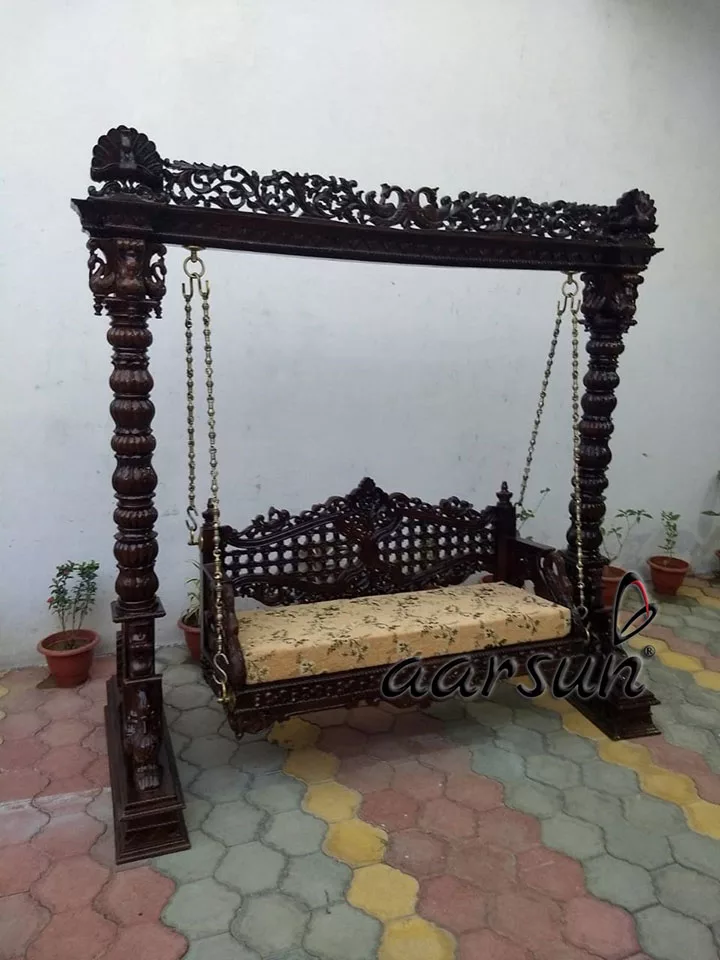 Aarsun prefers Handcrafted Indoor Swing/ jhoola made from premium quality wood. Wooden swings consist of two strong pillars with a small round design along its length with brass knobs on the upper portion and standing on the high base having rounded width and connecting shaft supporting the central swing. the pillar consists of a lock with rounded width attached to the rectangular design of the pillar. The indoor swing set shows the pillars connected with rounded shafts with small dowels in between them as design. A small wooden shaft is present over the shaft with an interconnected lock.