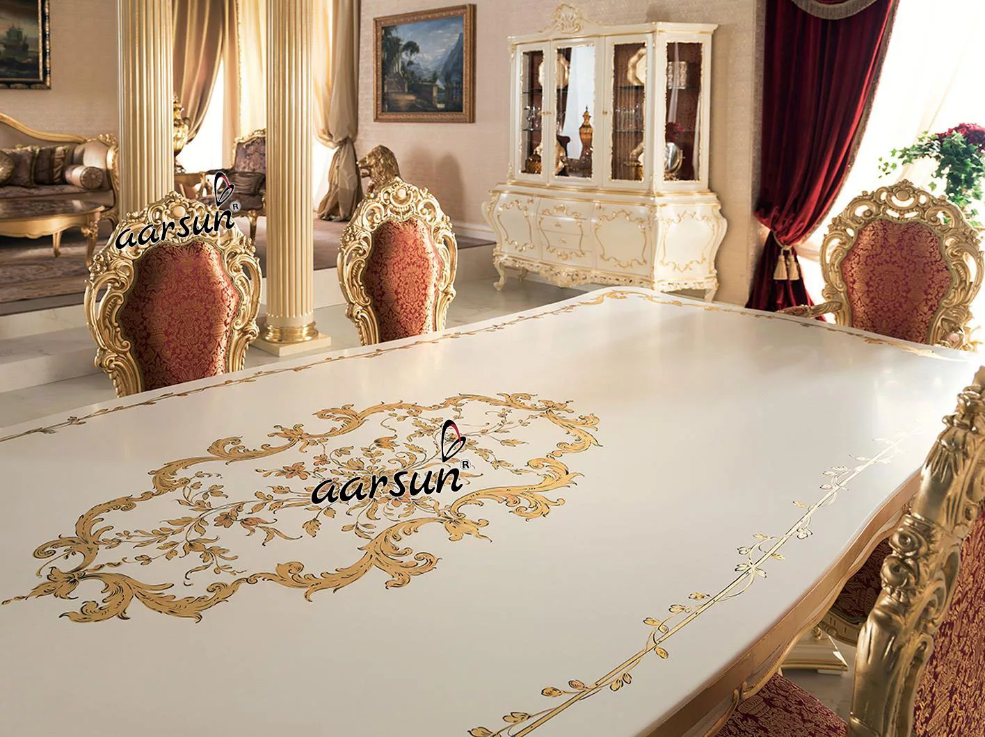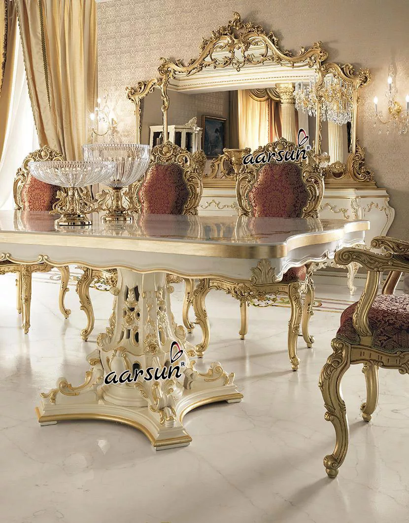 The dining room is regarded as the soul of the house where all family members spend quality time together. Aarsun Luxury 8 Chair Dining Set keeps the dining area’s atmosphere pleasant and royal. The Dining Set has a master dining chair that has beautiful fabric, designed as per the client’s choice. Dining chairs are double carved in Antique Gold Finish. The Dining Table has a plain top with heavily Carved Legs.