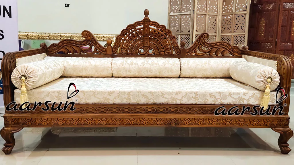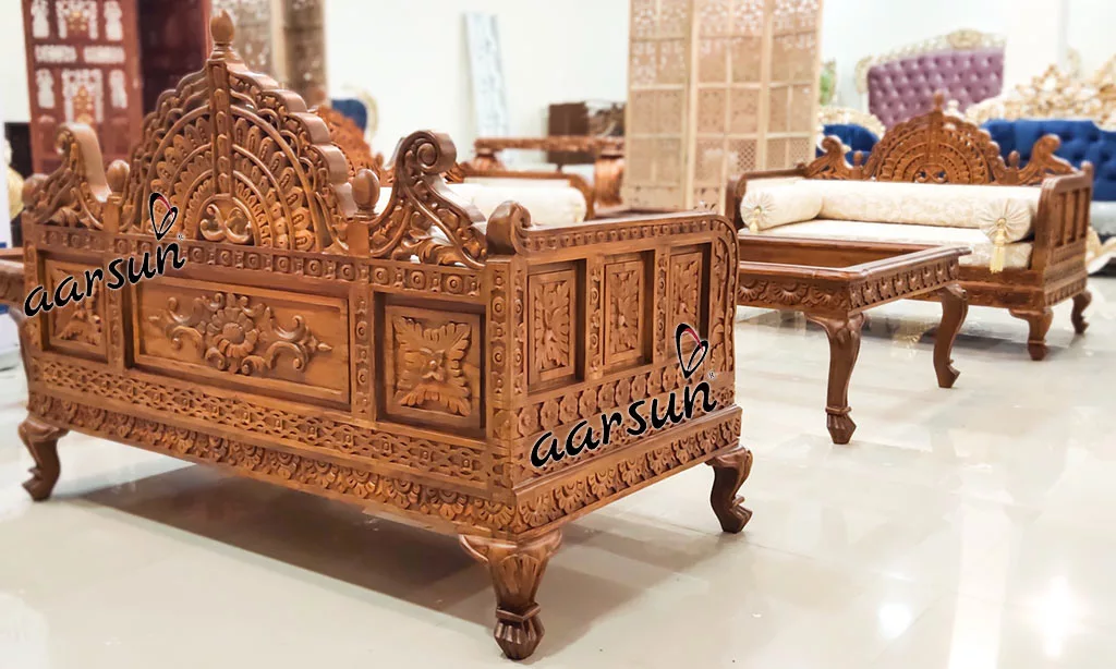 Aarsun brings to you a Rajwada sofa Set for your living room. The 7-seater Teak Sofa Set with Rajasthani style carving. It has an elegant design that enhances the interior decor of your living room. The upholstery of this sofa makes it very comfortable at home, the floral carving back gives the traditional look to the Set.