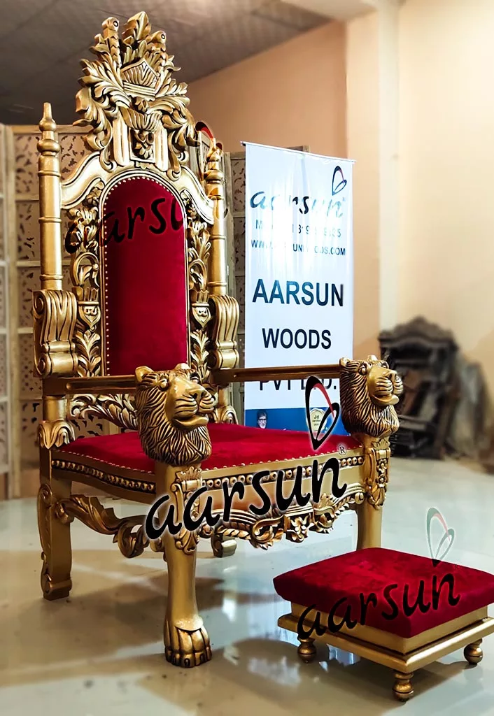 The Wooden Majestic Guru Maharaj Chair is handcrafted by skilled artisans of Aarsun The chair is made in premium quality teak wood with a traditional royal design. Aarsun Woods brings you this handmade Guruji Maharaj Ji Golden Chair Singhasan made in premium quality Teak Wood with beautiful Wooden Carving at the back and Lions on the handles  Customization is also available.