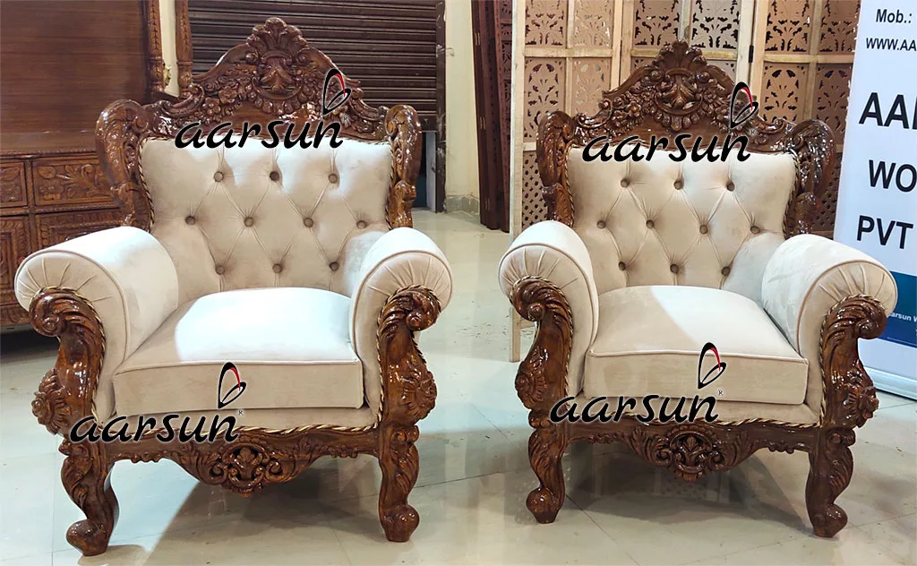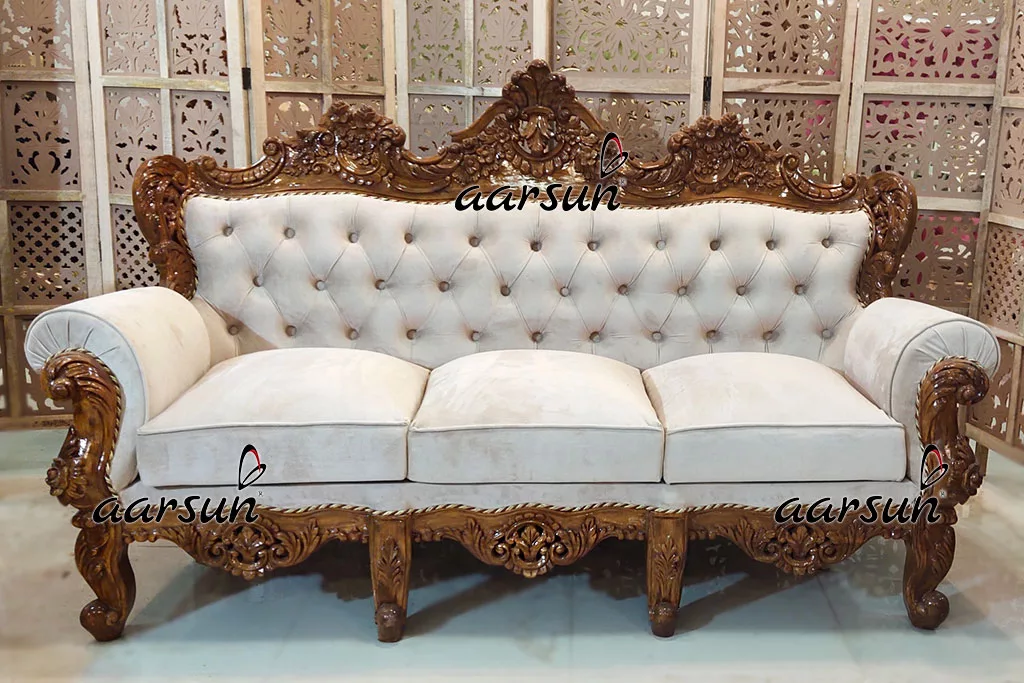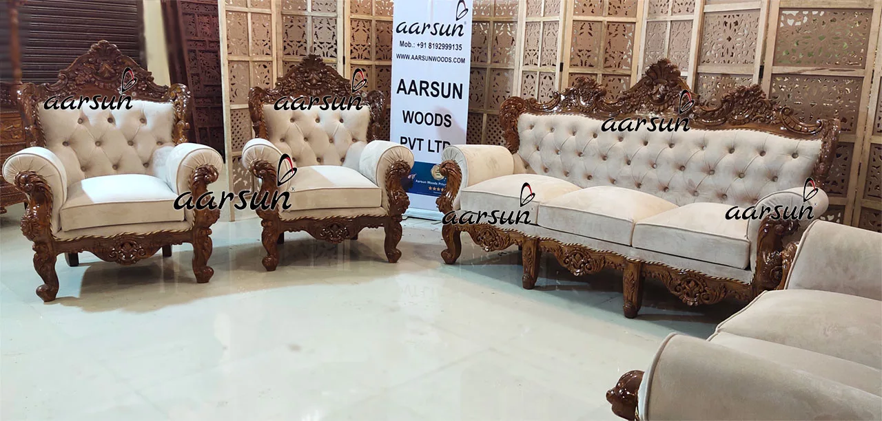 Aarsun Give your home a complete look with this traditional Handcrafted 7 Seater Tufted Back Sofa Set in Teak Wood. It is designed with handmade by skilled artisans that adds to its beauty. The Living Room Furniture set is designed specifically for ones with a need for something fine and royal.