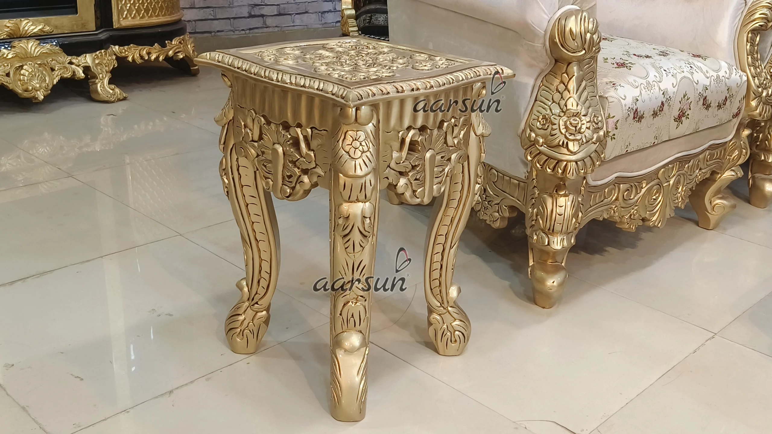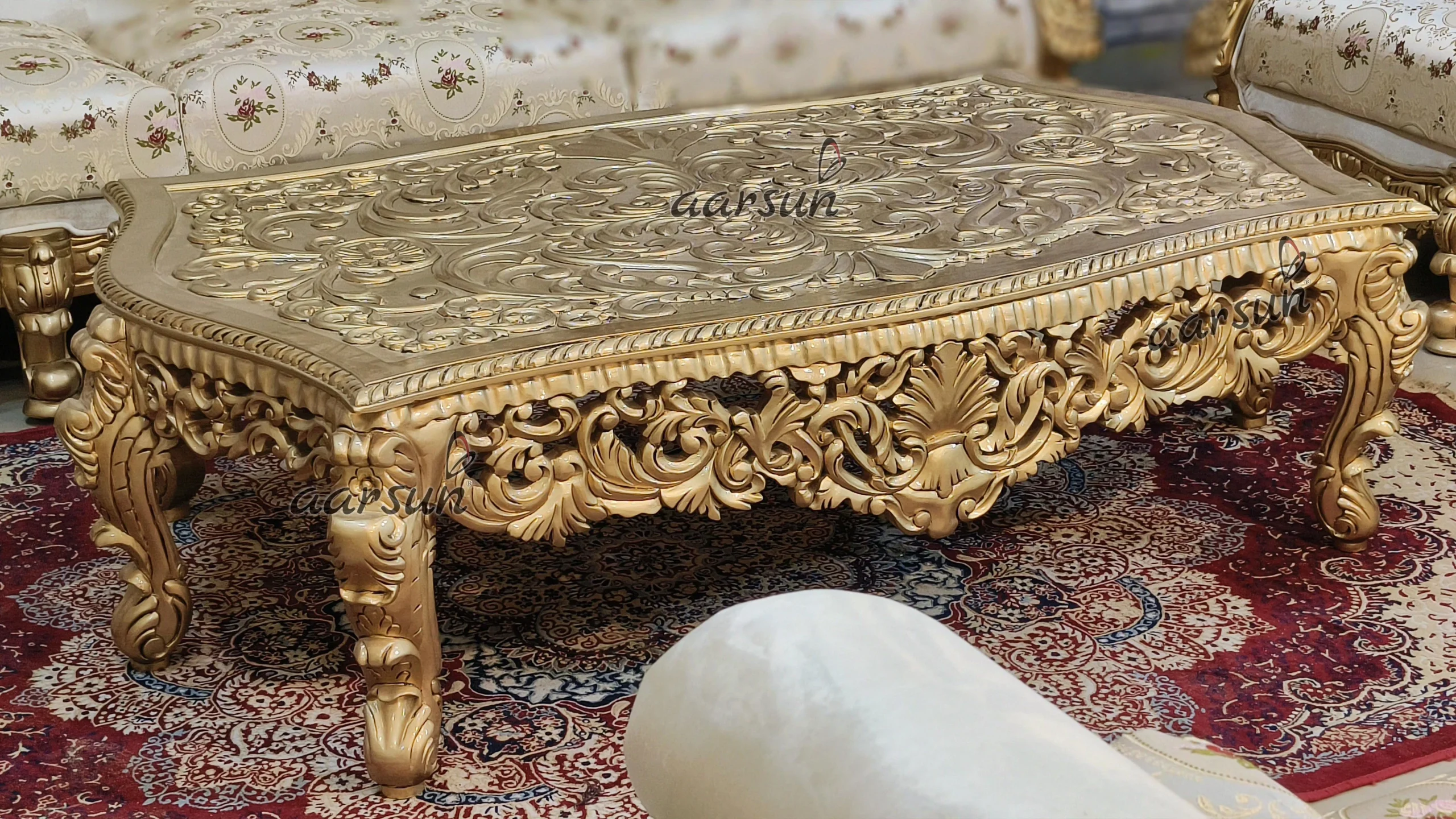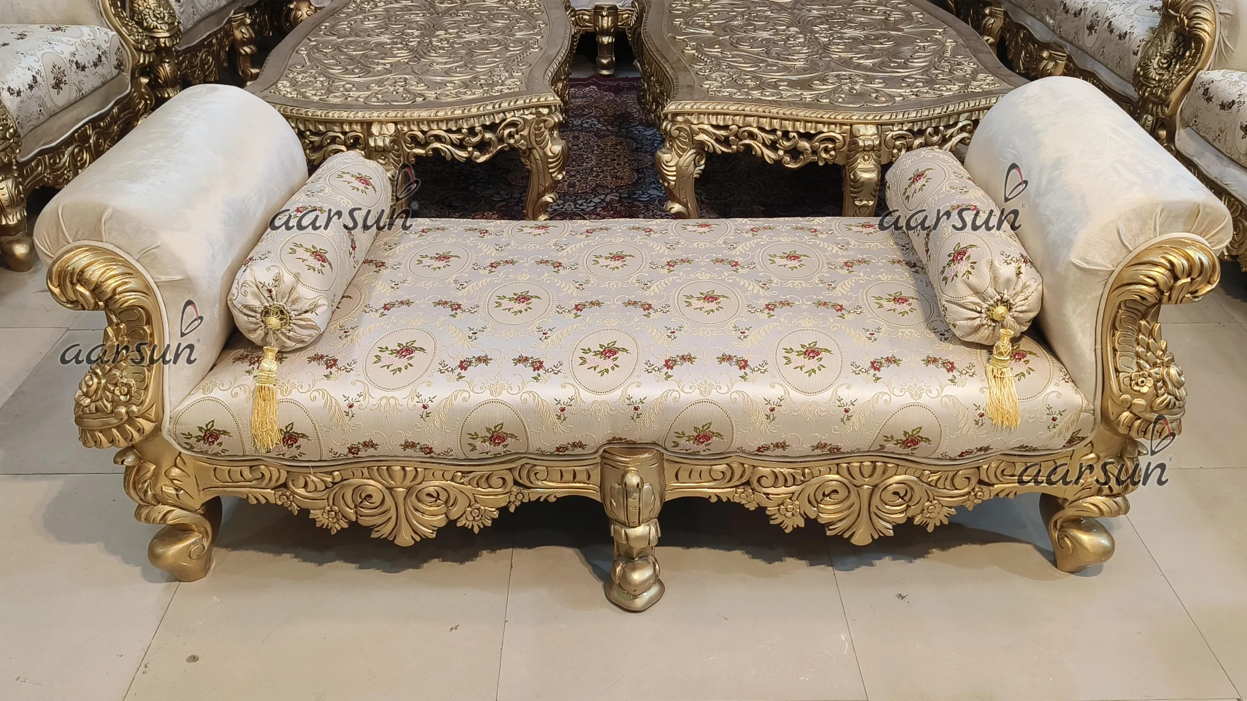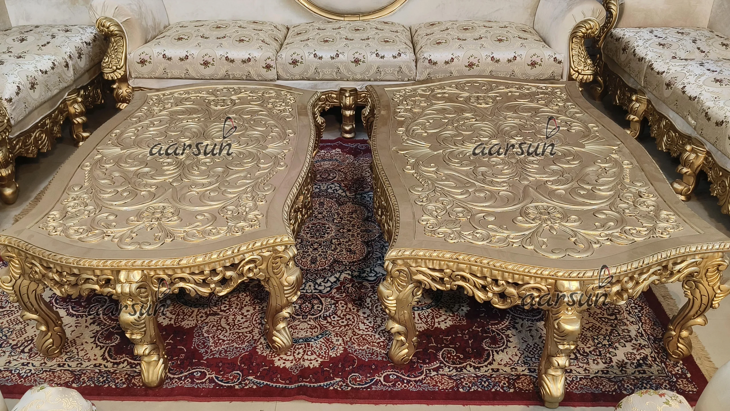 Aarsun presents the latest Heavy Full Hand- Carved Sofa set design, made in solid teak wood. This sofa set is hand-carved beautifully by our skilled master artisans. This sofa set is heavy and has a royal appearance. This beautiful designer sofa set is upholstered in beautiful fabric . The sofa is not just a normal sofa but a Maharaja sofa set because of its appearance . With 3 to 4 inches deep carving back , this sofa looks designer as well as classy. The back of the sofa set is carved beautifully with 3 to 4 inches deep carving work. With a center table rectangular table that is fully hand carved, adorned with beautiful floral hand carvings makes this sofa set a luxury sofa with an extreme charm look. This is accompanied by side tables that are adorned with beautiful floral leafing hand-carving.