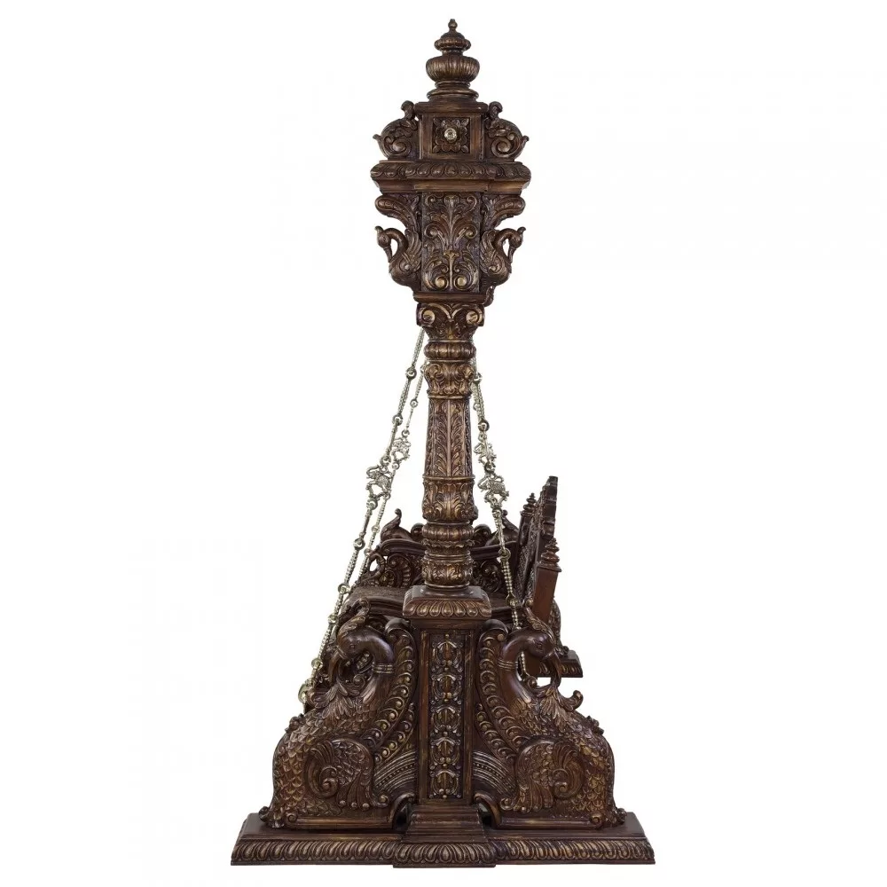 The wooden Indoor Floor Standing Swing consists of beautifully engraved peacock-themed pillars with a central shaft supporting the central swing. There are two pillars erected on a decorated pedestal having two elaborately carved peacocks at the base. The swings pillars show handcrafted all over with peacock engraved over beautifully designed at the top. There is a bow-shaped shaft connecting the two pillars with a central floral motif and brass peacock knobs on the upper side and brass hops on the lower side.
