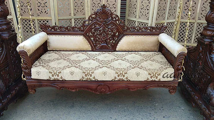 Indoor Wooden Swing is traditionally handcrafted in premium quality Teak Wood. The unit consists of 2 pillars on sides with a hand-carved Swan theme and floral pattern designs. The main swing chair is sturdy enough and is also made of Teak Wood. The chair is attached from the top with the metal chain attached. The chain has a rugged shine with a matching design. The Swing Chair has floral carvings all over with cushioning at the seat and at the center back. Overall the unit is polished in Walnut Finish.