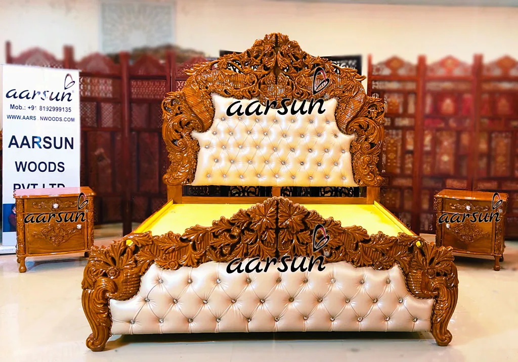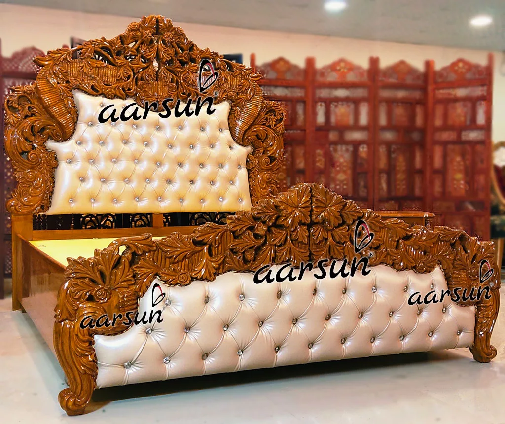 Aarsun brings you a Carved Wooden Premium Bed in Honey Finish for Luxury homes or palaces. It has a stunning design that enhances the interior decor of your bedroom. Take a look through our wide range of Handcrafted Royal Wooden Bed Set, available in many styles and sizes. We have worked with designers and craftsmen to create a unique line of home furnishings, hand-carved from solid hardwoods, and molded into exquisite pieces for your homes. This Bed is made with premium quality Teak Wood.