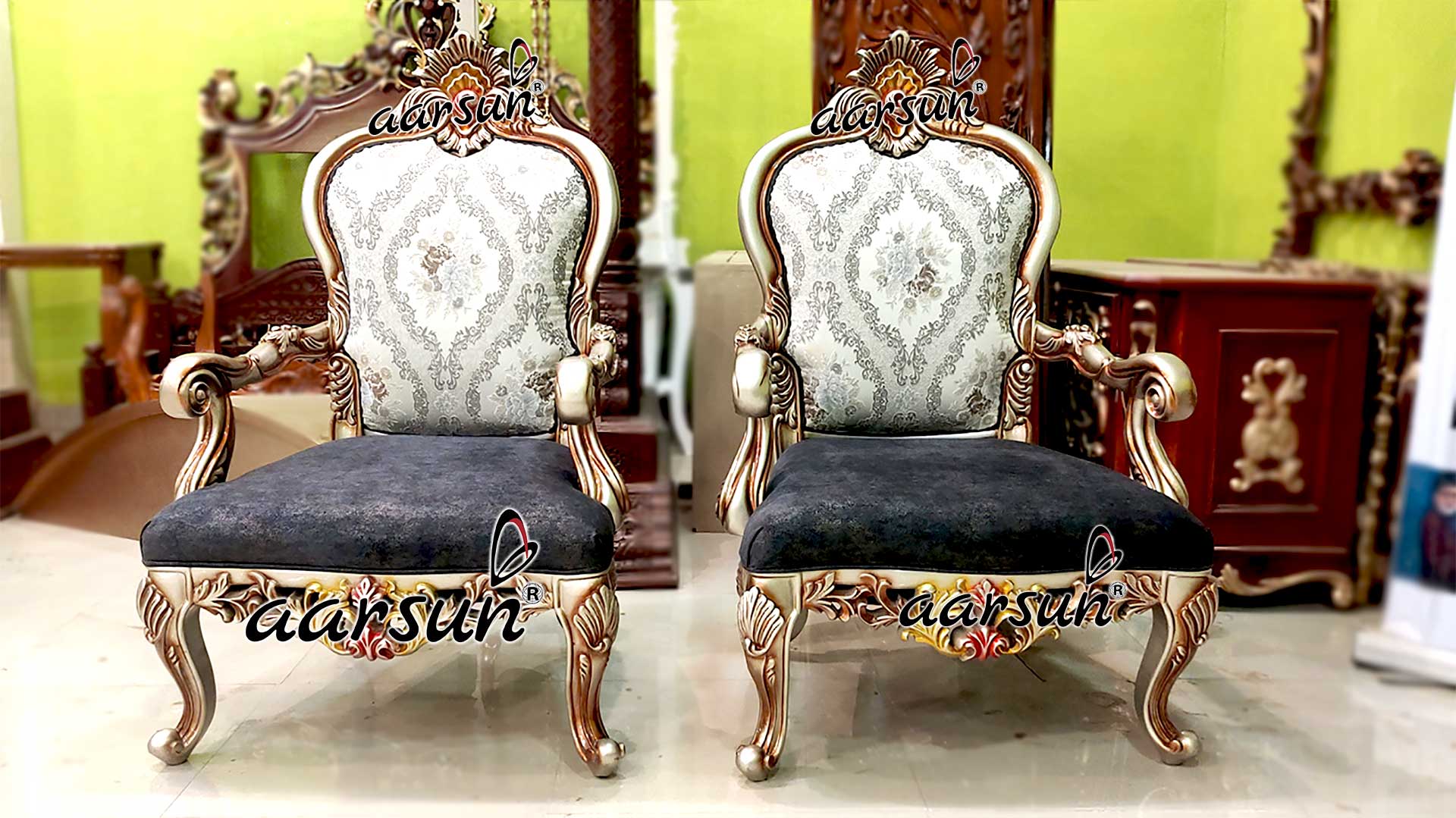 The Latest Royal Sofa Set is a great fusion of luxury and comfort. This is carved out in premium quality teak wood. The unit consists of 4 Seater, 3 Seater, and 2 Chairs. The Base Color of this unit is Metallic Champagne with Brownish Gold Shading. The Double Carved Chairs Can be used also as Bedroom Chairs or Lobby chairs. There is a Big Damask Design on Chairs Front & Back.