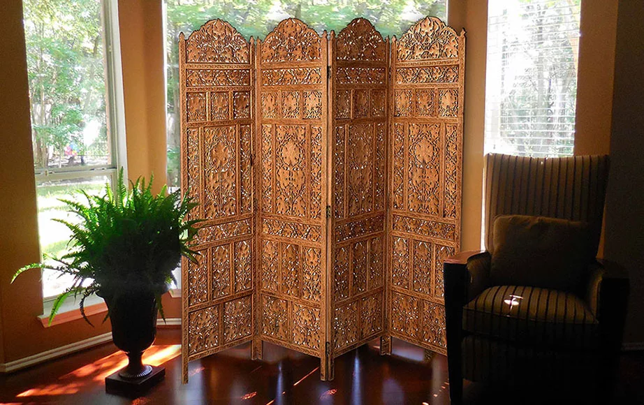 Time to manage your room space with this classic room divider, this charming screen has four fold-able panels. This Leaves Carved Room Divider has antique appeal to it, crafted with the finest quality wood this room divider will remain in pristine condition for years to come. This Partition screen has elegant caramel and brown color with a distressed finish, the intricate carving makes it look more exquisite.