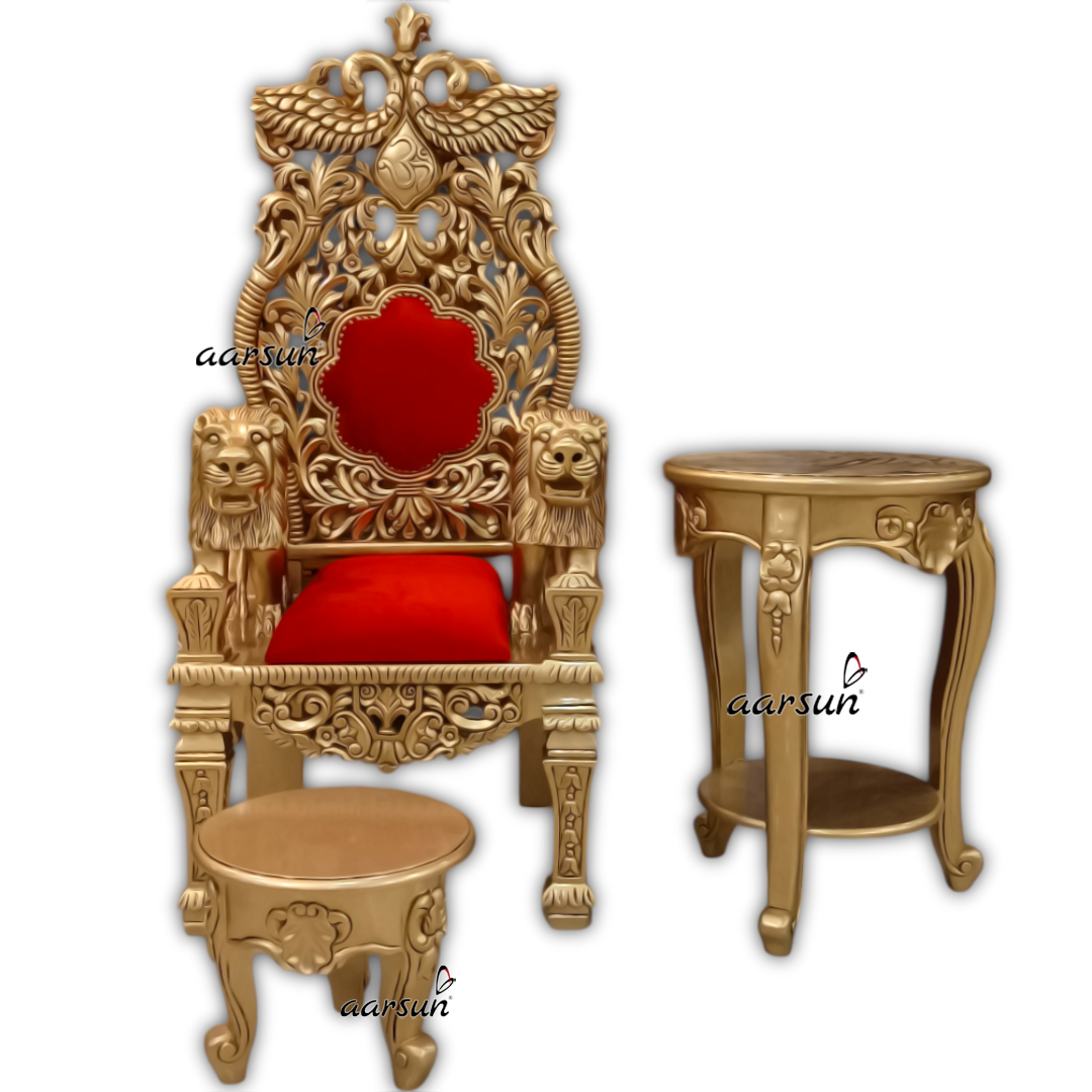 This Antique Guruji chair footrest and stool is crafted from high-quality teak wood in antique gold paint to provide durability and longevity. This Stunning Guruji Chair is created with both style and comfort, and it has lion face Designs. The teak wood frame is beautifully created in a modern sleek and stylish design that will harmonize perfectly with every décor style.